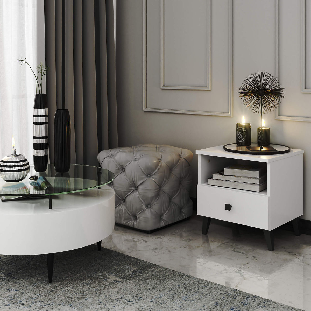 Stolik nocny MOBI K01 z szufladą i półką w kolorze białym i czarnym. .. więcej