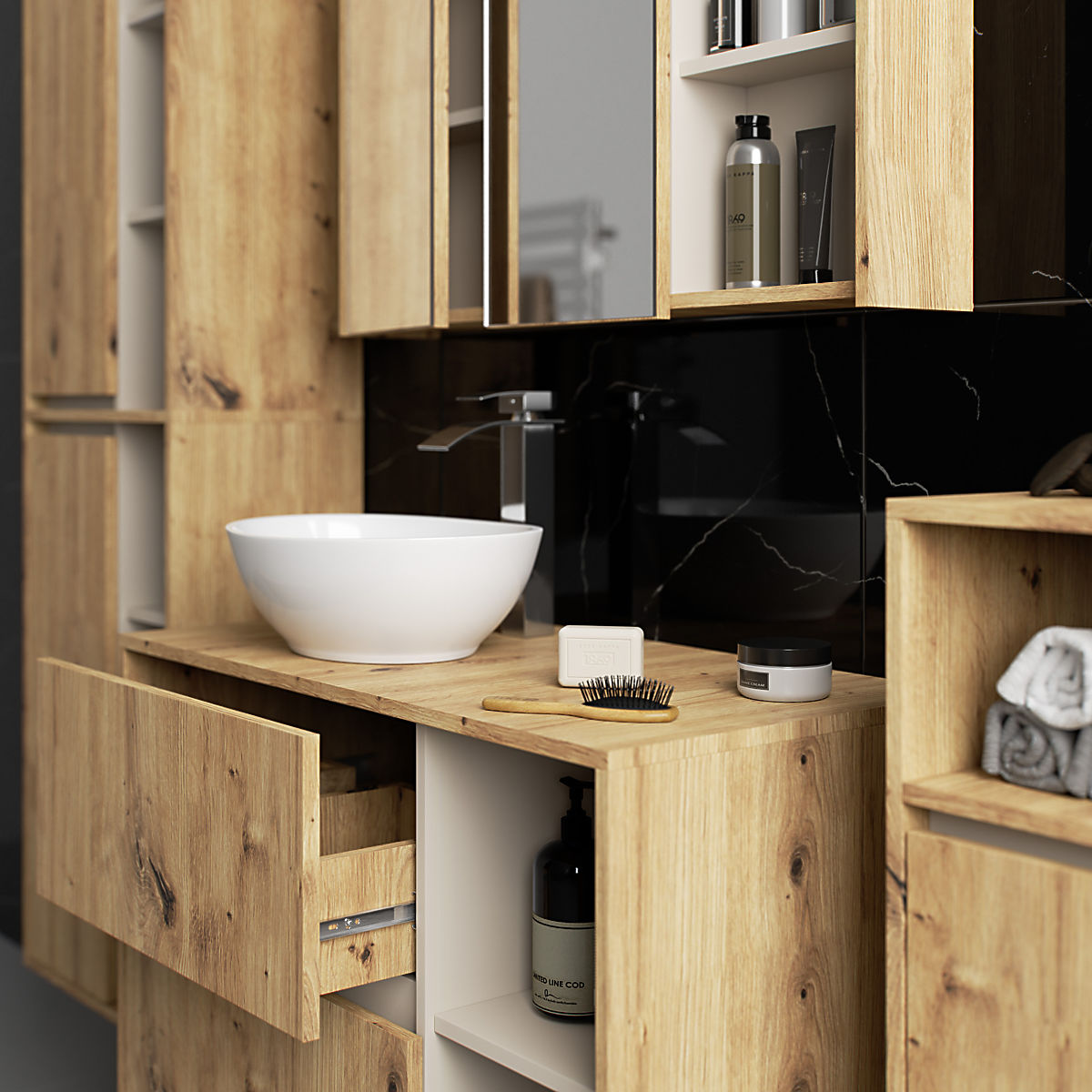 Szafki łazienkowe doskonale uzupełniają wyposażenie łazienki, zapewniając potrzebne miejsce na wszystkie kosmetyki i detergenty oraz dodając łazience pewien styl. Przestronne szafki ułatwiają utrzymanie porządku w pomieszczeniu, co korzystnie wpływa na estetykę wnętrza. Kolekcja VAMI charakteryzuje się przyciągającą wzrok stylową kolorystyką – korpus i fronty mają ten sam kolor, podczas gdy wnętrze jest w innym odcieniu.