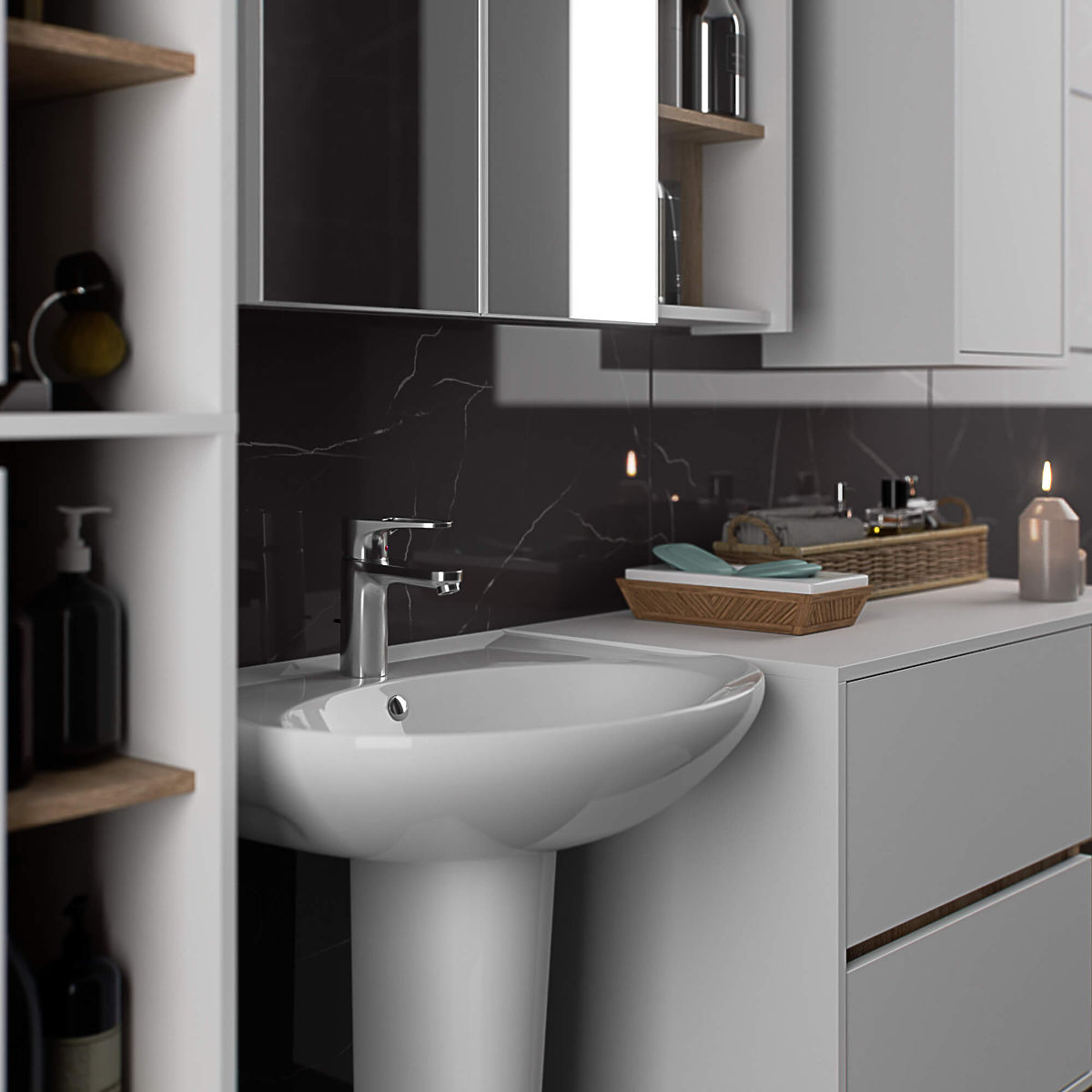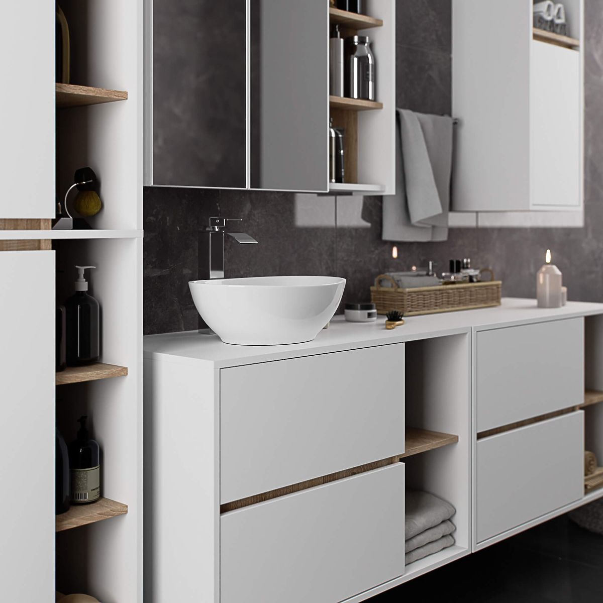 Szafki łazienkowe doskonale uzupełniają wyposażenie łazienki, zapewniając niezbędną przestrzeń na kosmetyki i środki czystości oraz nadając łazience specyficzny styl. Przestronne szafki ułatwiają utrzymanie porządku, co korzystnie wpływa na estetykę wnętrza. Kolekcja VAMI wyróżnia się atrakcyjnym stylowym wykończeniem kolorystycznym – korpus i fronty mają ten sam kolor, podczas gdy wnętrze jest w innym kolorze.