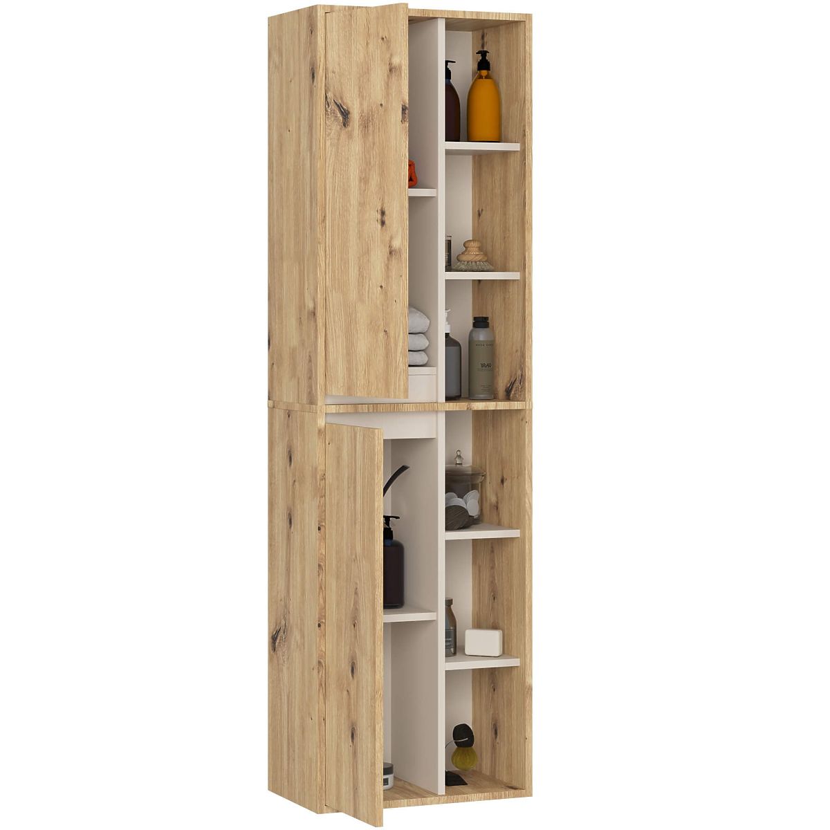 Wysoka szafka łazienkowa VAMI W50 jest przeznaczona do montażu na ścianie. Dzięki tej szafce cała kosmetyka, akcesoria łazienkowe oraz ręczniki znajdą swoje miejsce, a wnętrze będzie wyglądać schludnie. Przemyślana konfiguracja z zamkniętą i otwartą częścią umożliwia wygodne przechowywanie różnorodnych produktów.