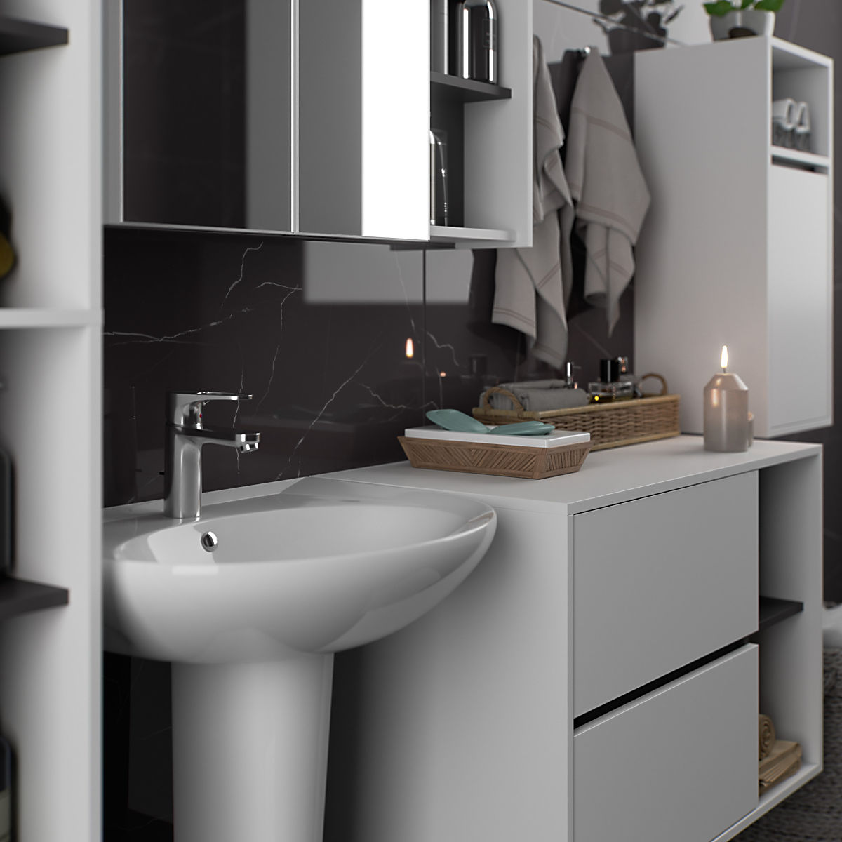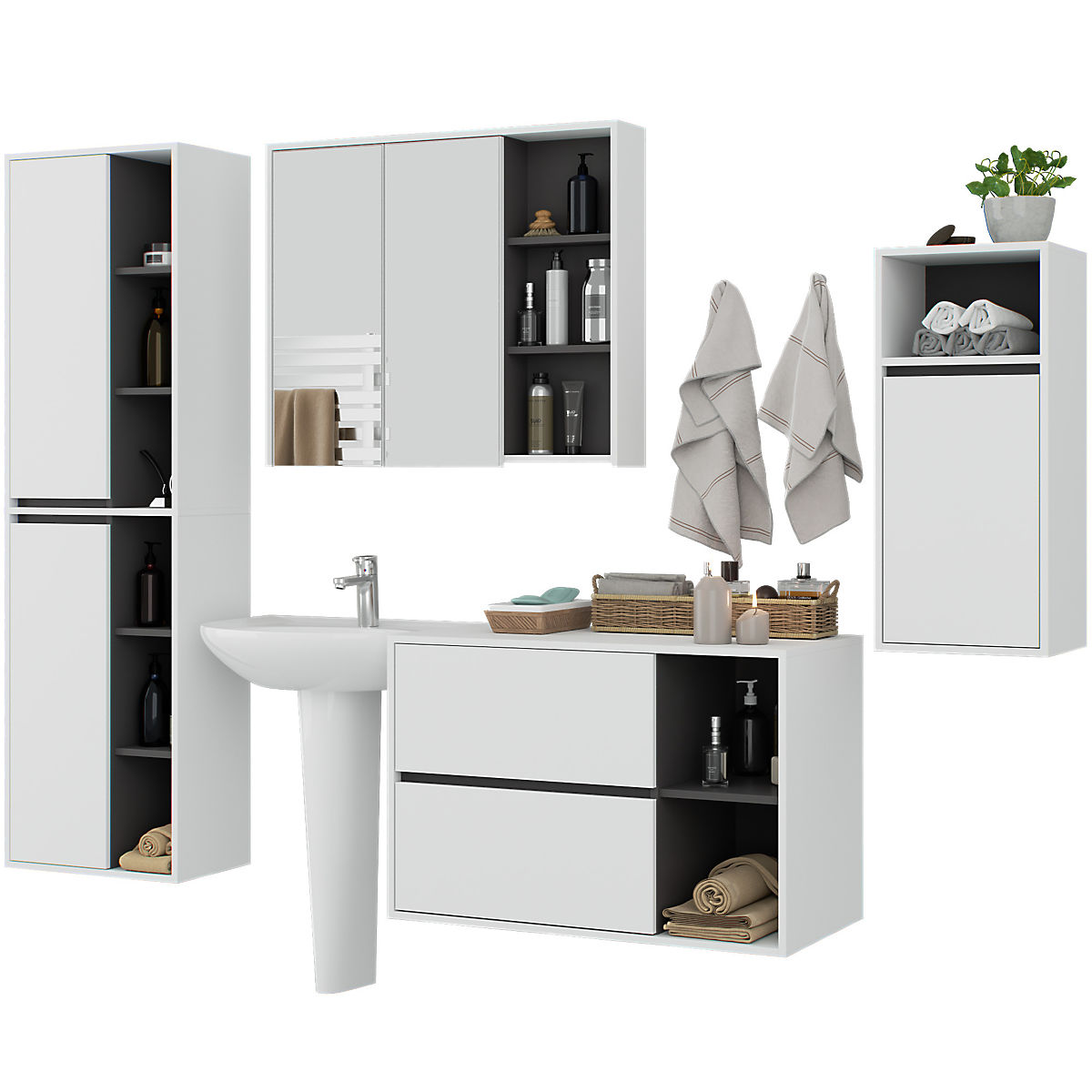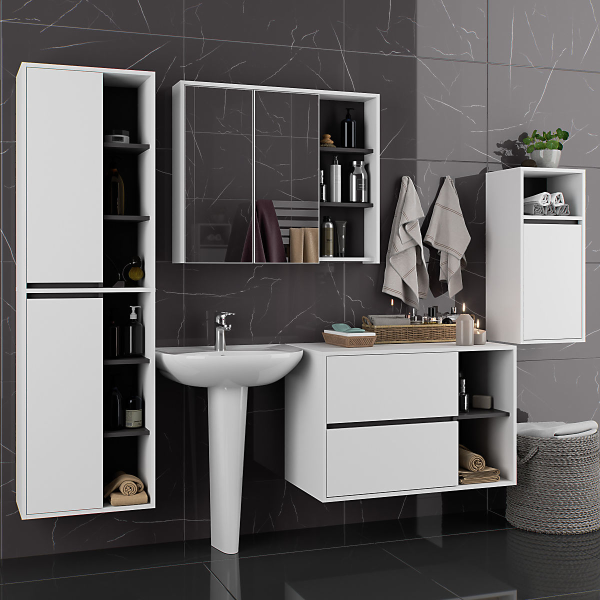 Szafki są niezależne, co pozwala na ich aranżację w dowolnej konfiguracji i odstępach według własnych potrzeb. Cena dotyczy wyłącznie szafek łazienkowych, elementy dekoracyjne nie są częścią zestawu.