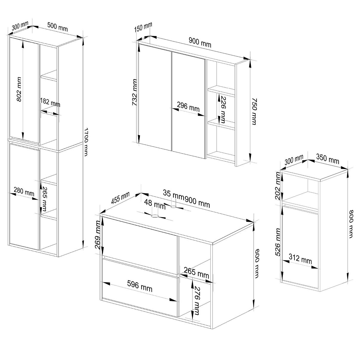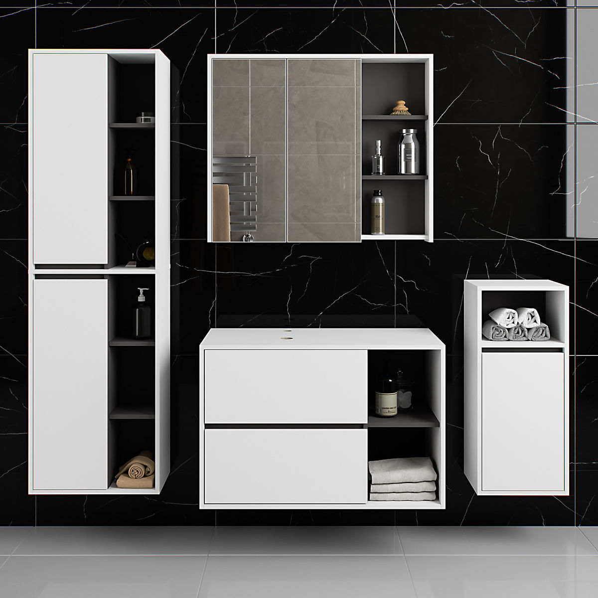 Zestaw mebli łazienkowych VAMI z szafką pod umywalkę doskonale wpisuje się w aktualne trendy w projektowaniu wnętrz. Interesujący design z otwartymi półkami nadaje łazience przyjemny i stylowy wygląd. Wszystkie szafki w tym zestawie są przeznaczone do montażu na ścianie. Zestaw został zaprojektowany tak, aby zapewnić wystarczającą przestrzeń na kosmetyki, artykuły higieniczne i inne niezbędne rzeczy w łazience. Opisany zestaw mebli obejmuje: