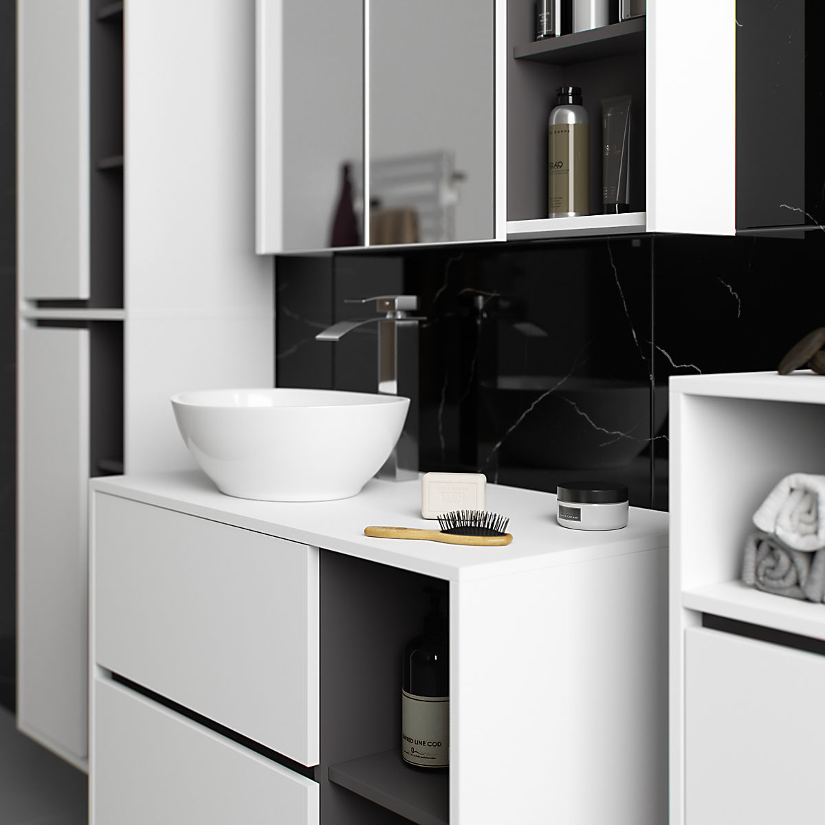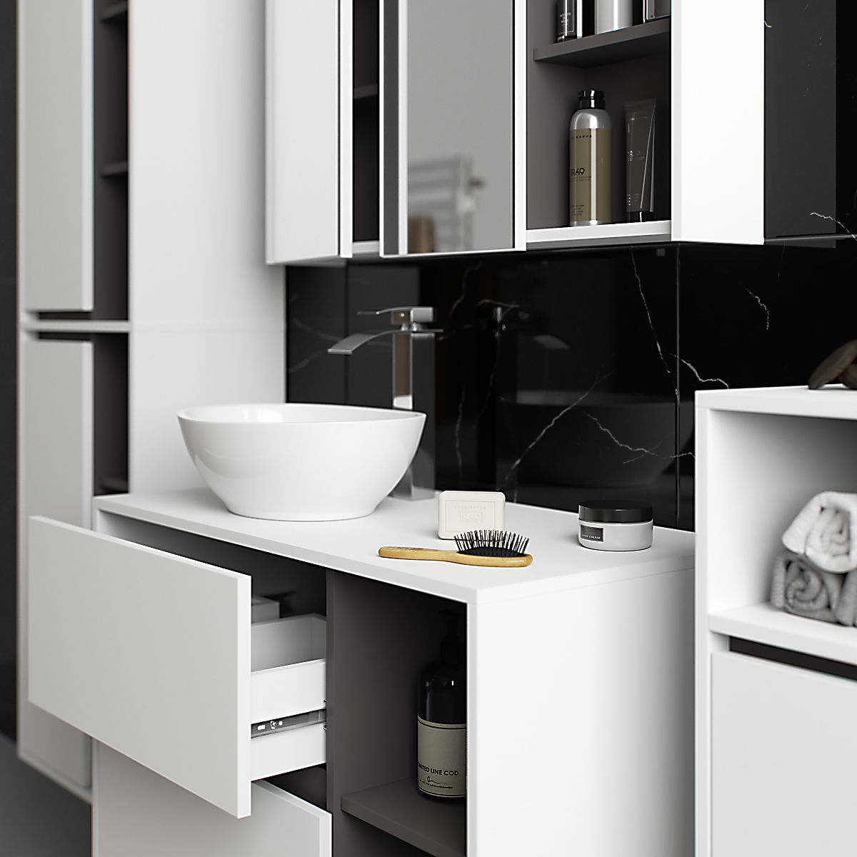 Szafki są niezależne, co pozwala na ich rozmieszczenie w dowolnej konfiguracji i odstępach według własnych potrzeb. Cena dotyczy tylko szafek łazienkowych, elementy dekoracyjne nie są częścią zestawu.
