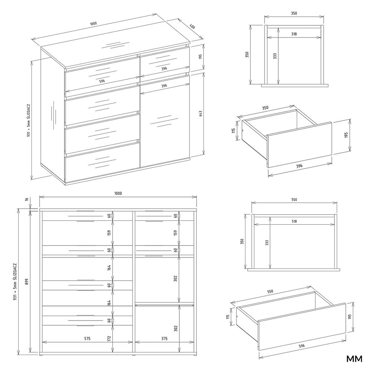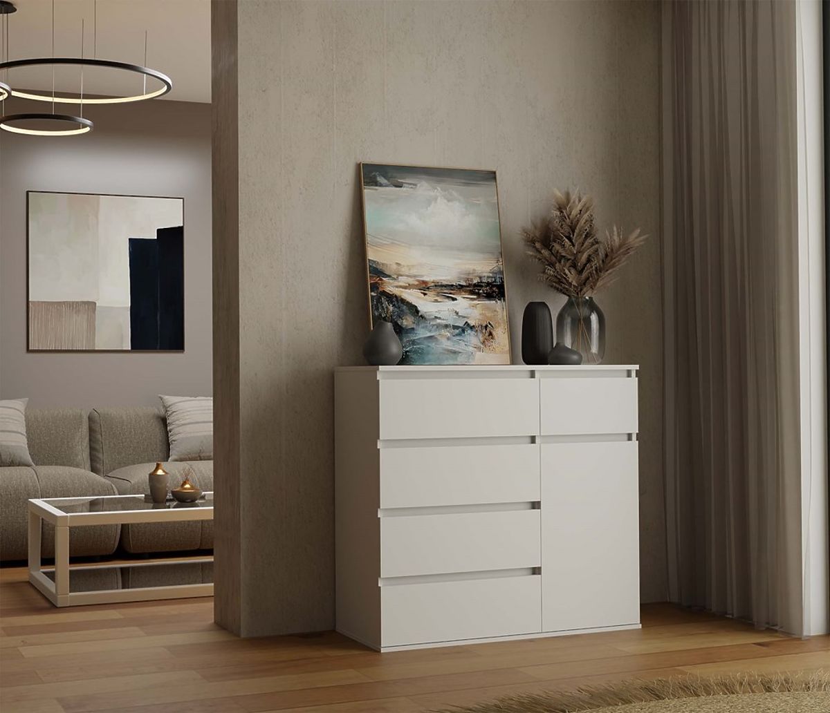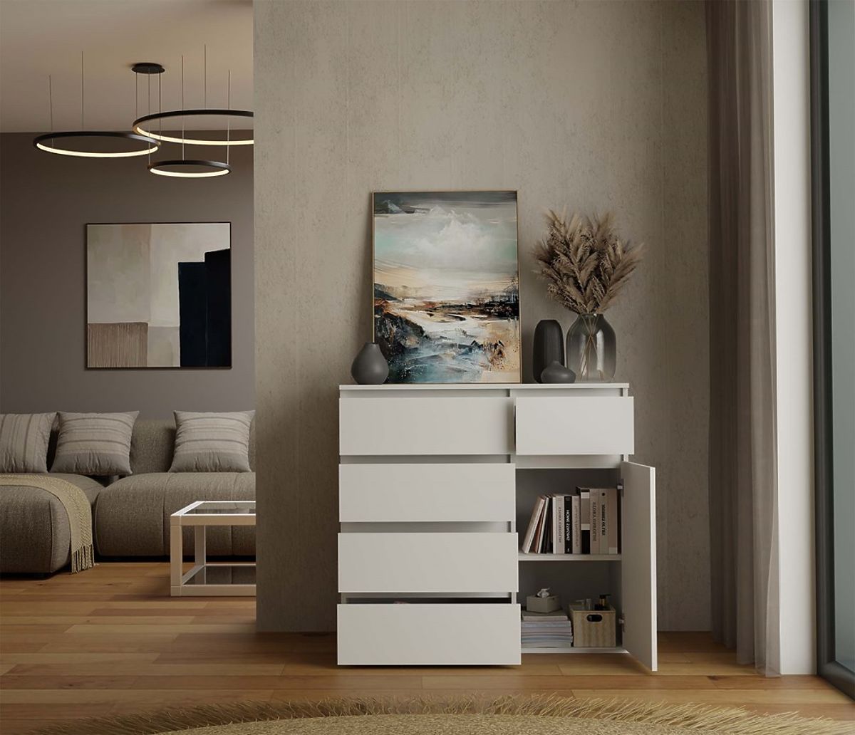 Biała komoda 1D5S z 1 drzwiami i 5 szufladami. .. więcej