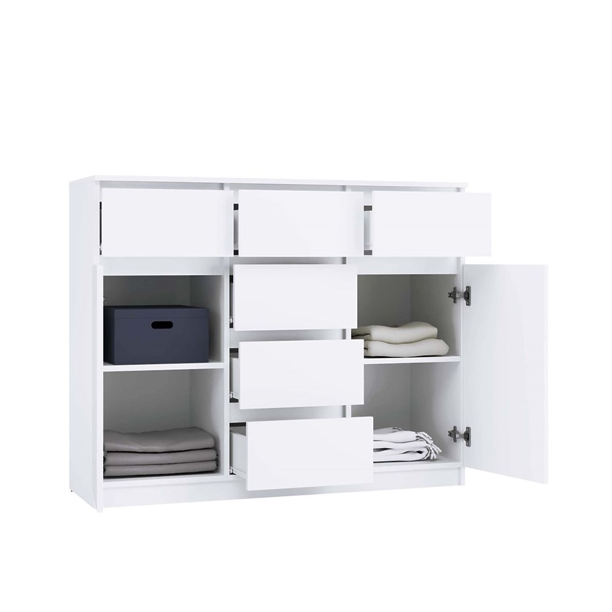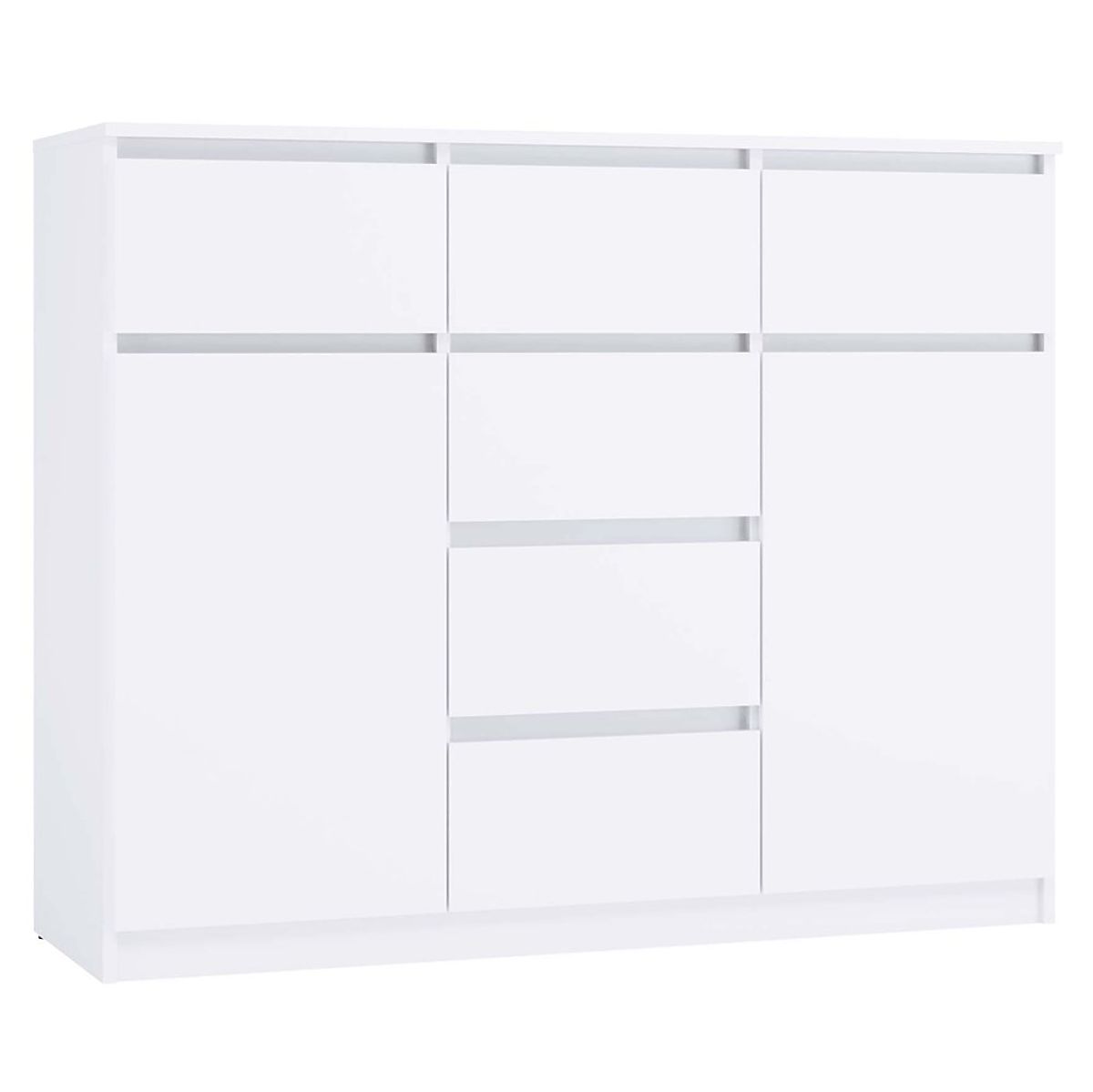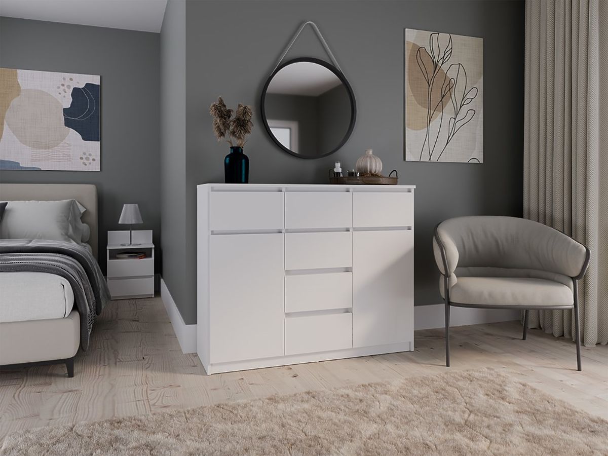 Uniwersalny design: Prosta, elegancka forma komody w matowej bieli sprawia, że pasuje zarówno do nowoczesnych, jak i klasycznych wnętrz. Fronty bez uchwytów podkreślają minimalistyczny charakter, zapewniając jednocześnie wygodę użytkowania.