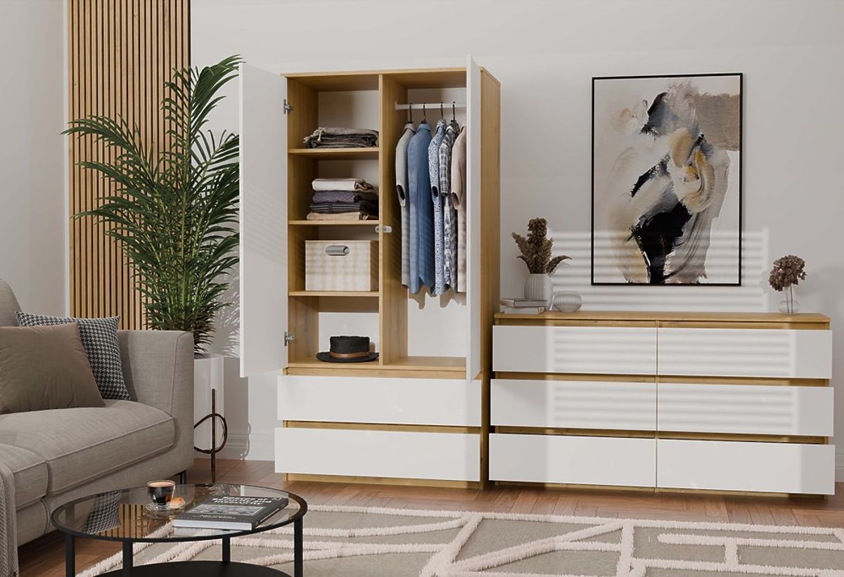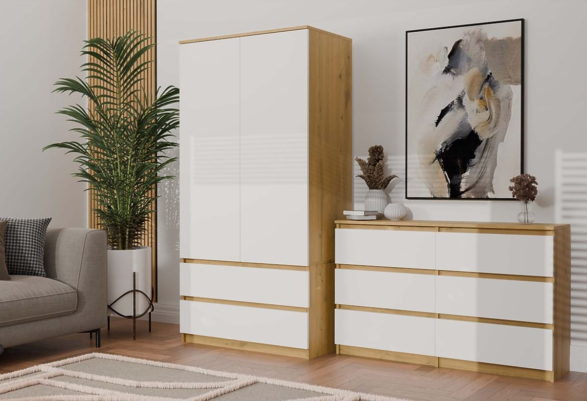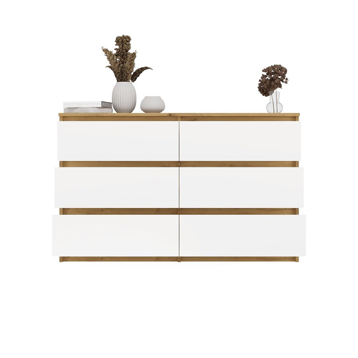 Przestronna komoda z 6 szufladami w kolorze dębu i bieli. .. więcej
