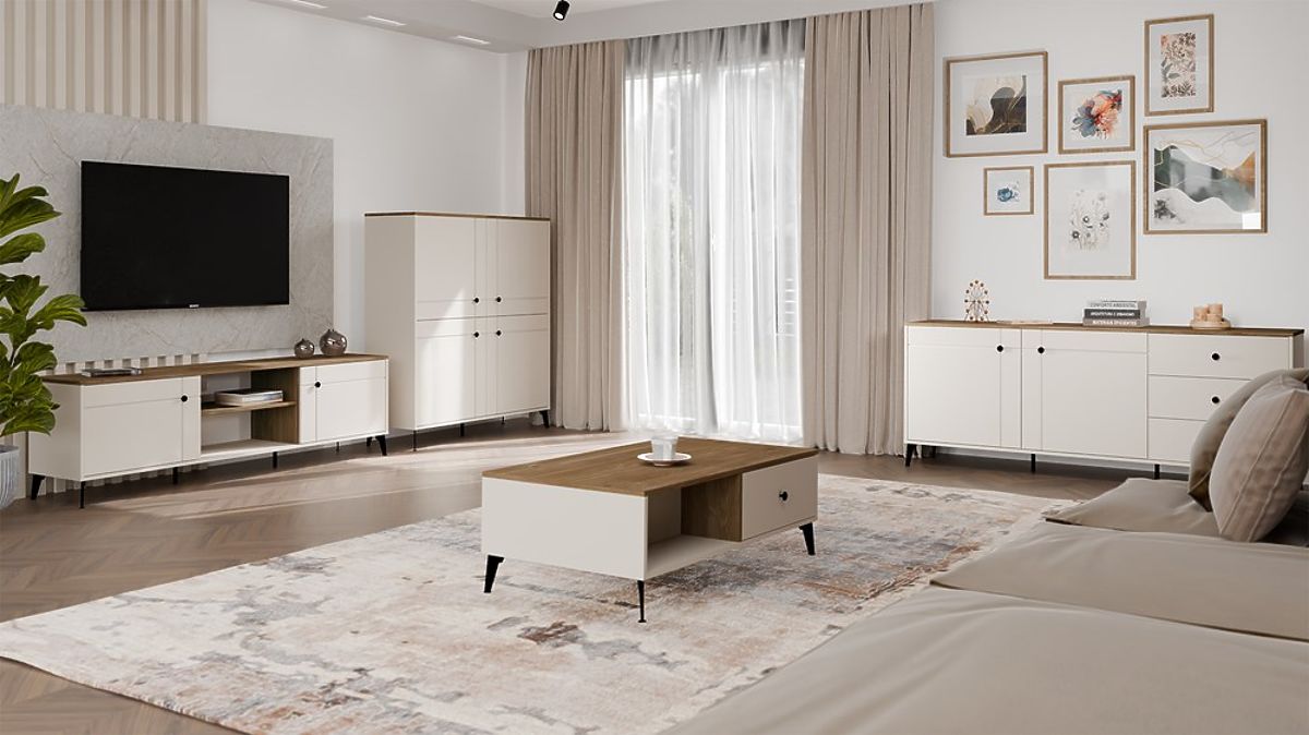 Komoda POINT 4D to propozycja dla tych, którzy cenią sobie styl, funkcjonalność i wysoką jakość wykonania. Połączenie modnego odcienia kaszmiru z naturalnym dekorem blatu Dąb Castello nadaje meblowi ponadczasowy charakter, który doskonale uzupełni zarówno nowoczesne, jak i klasyczne wnętrza.