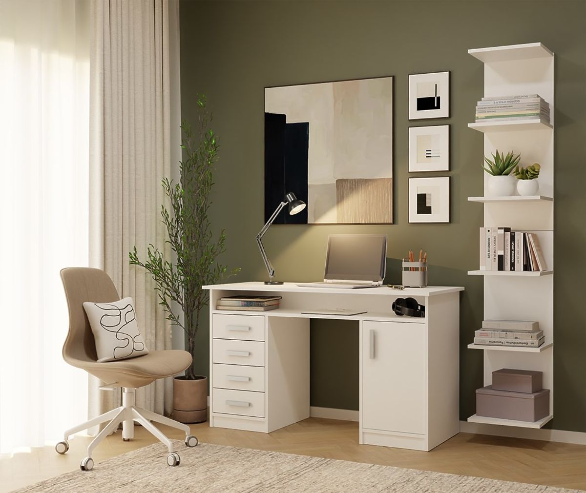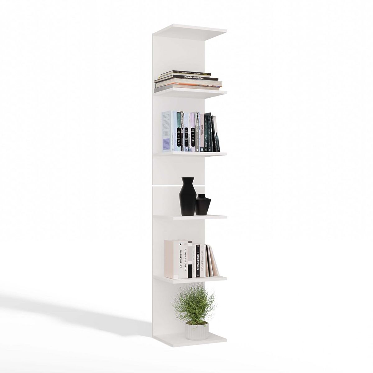 Regał 6P to minimalistyczny i funkcjonalny mebel, który doskonale pasuje do salonu, biura, pokoju studenckiego lub domowej biblioteki. Dzięki lekkiej, nowoczesnej formie i neutralnej białej barwie łatwo dopasować go do wielu aranżacji wnętrz.