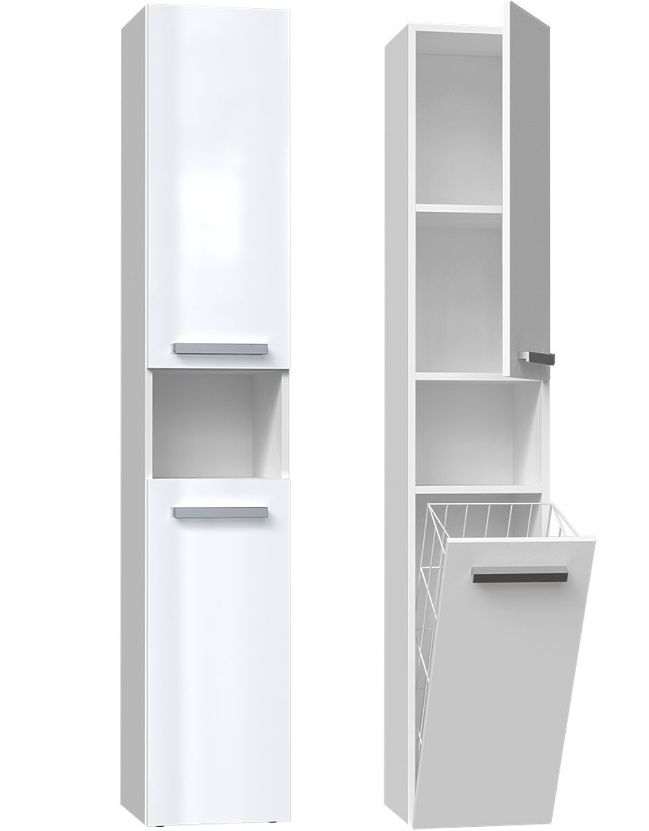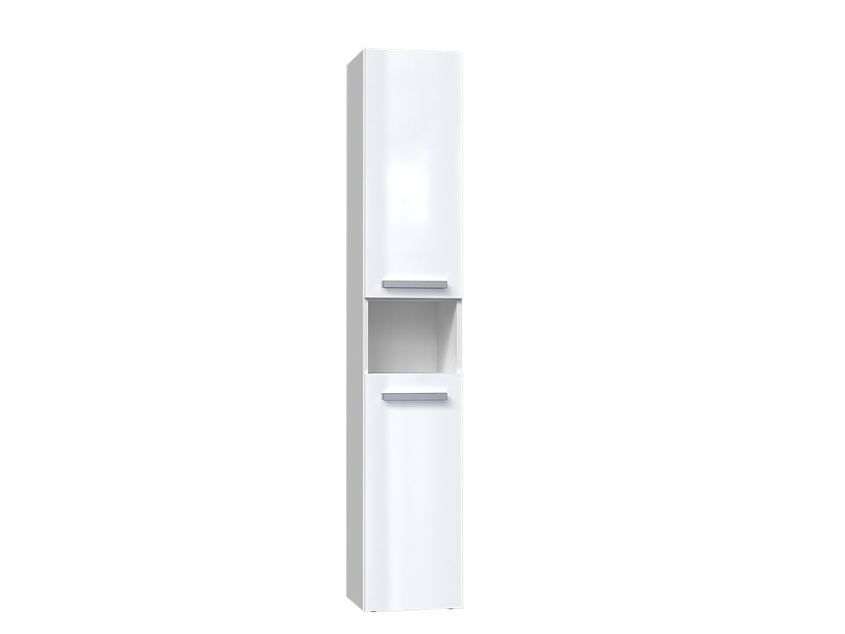 Szafka łazienkowa z białym połyskiem i krótkimi drzwiami. .. więcej