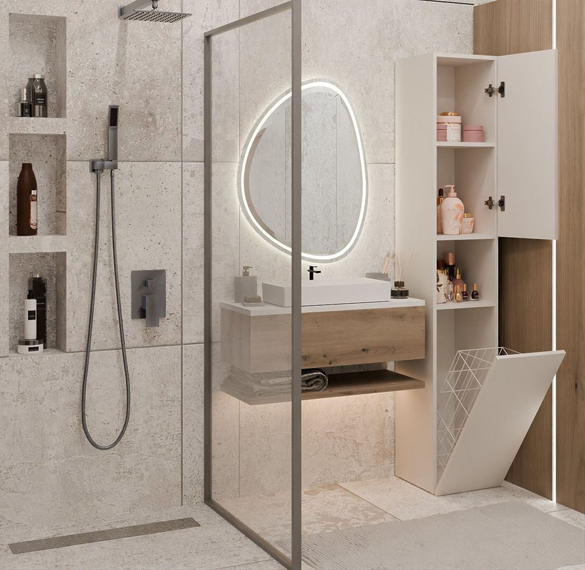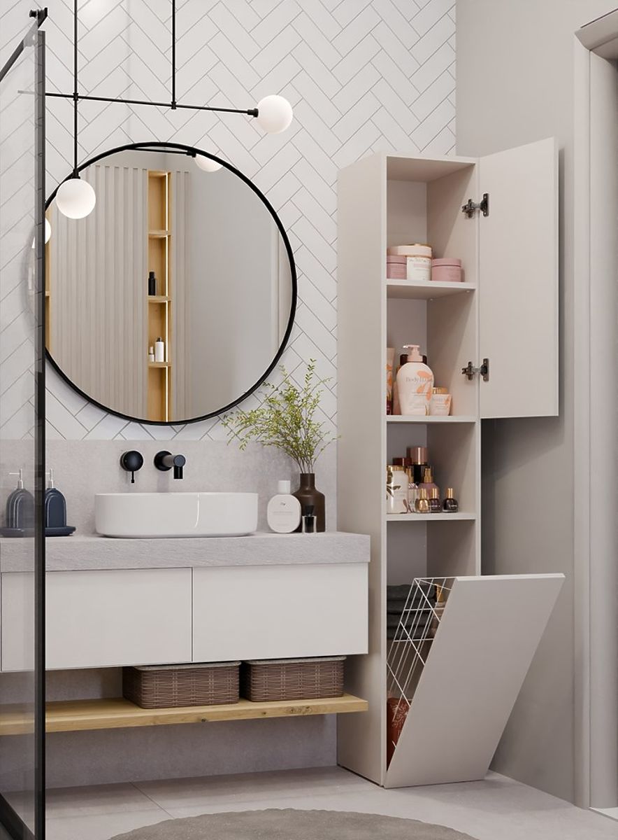 Szafka łazienkowa z krótkimi drzwiami i koszem na pranie. .. więcej