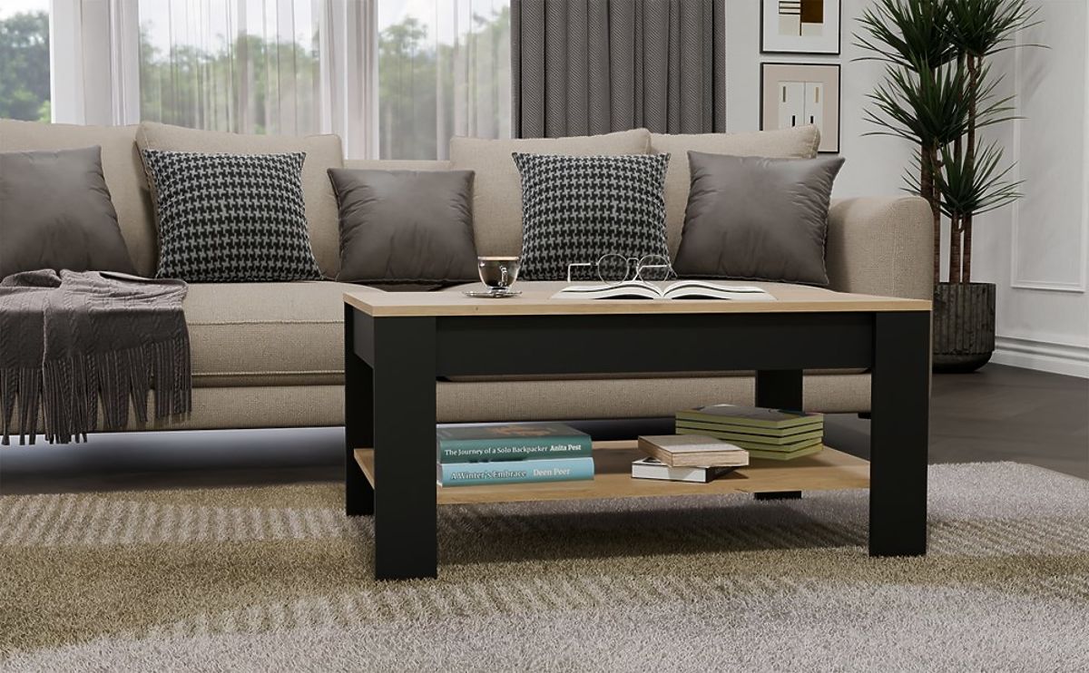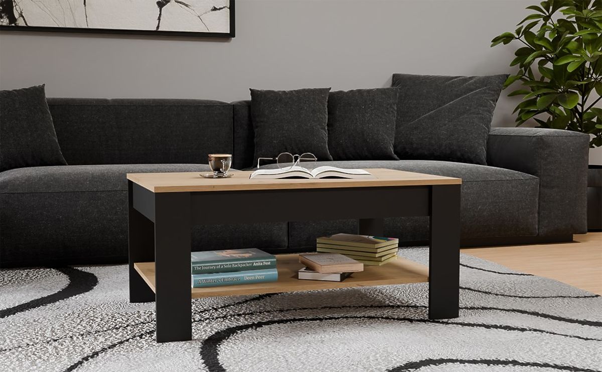 Nowoczesny stolik kawowy OHIO to doskonały dodatek do salonu, pokoju dziennego lub kącika relaksacyjnego. Połączenie dekoru Dąb Artisan z matową czernią nadaje meblowi nowoczesny i elegancki charakter. Minimalistyczny kształt i funkcjonalna dolna półka zapewniają, że mebel jest nie tylko estetyczny, ale także bardzo praktyczny w codziennym użytkowaniu.