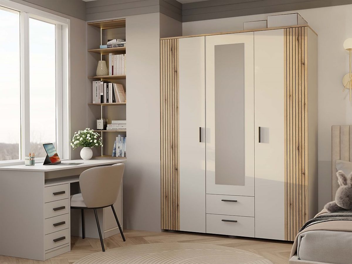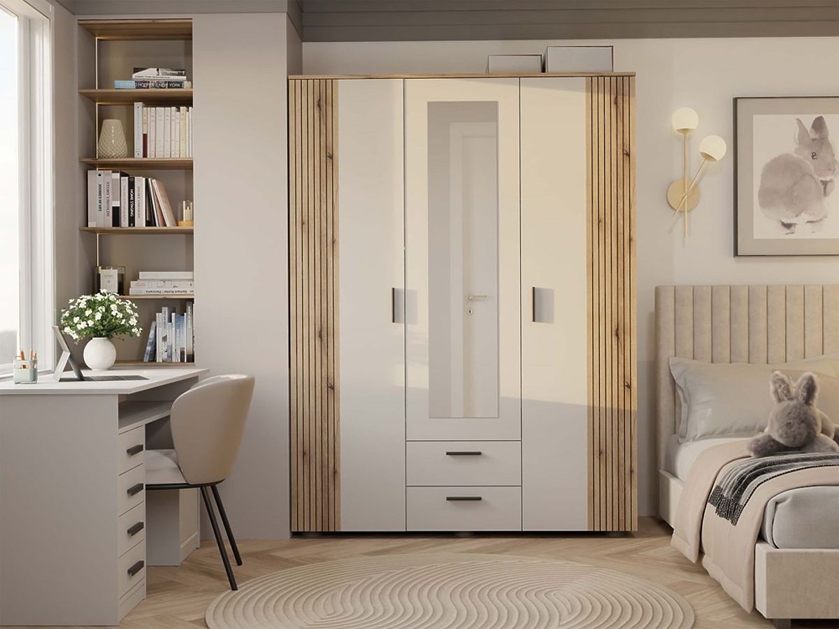 Nowoczesna forma z trzema drzwiami i centralnym lustrem – idealna do aranżacji w stylu nowoczesnym, skandynawskim i boho