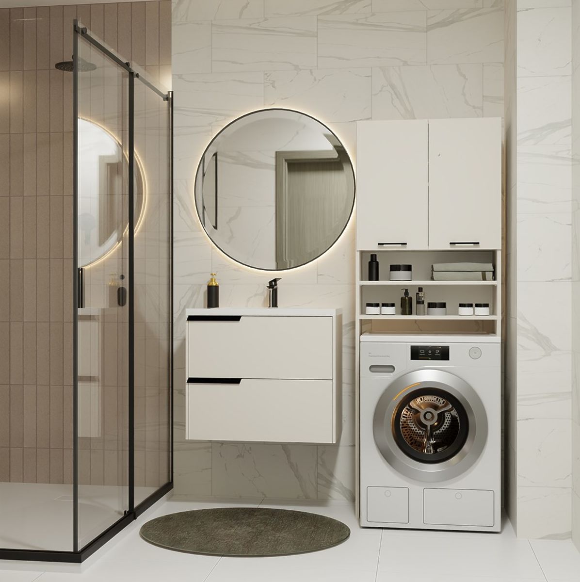 4 przestronne półki, z czego 2 ukryte za drzwiami – idealne na ręczniki, detergenty i akcesoria.