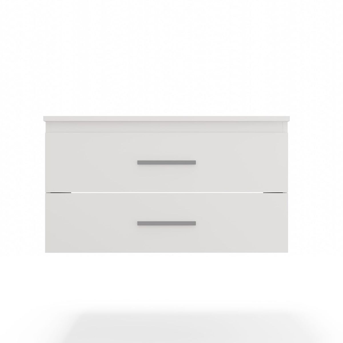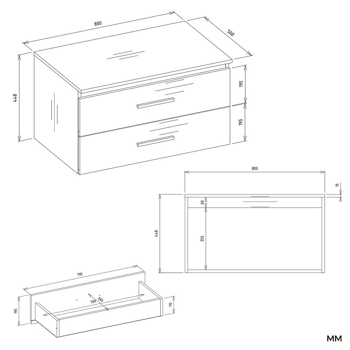 Mebel wyposażony jest w dwie przestronne szuflady, idealne do przechowywania kosmetyków, ręczników lub innych akcesoriów łazienkowych. Obie szuflady mają pełną głębokość – nie posiadają wycięć na syfon. Zastosowanie syfonu ściennego pozwala na pełne wykorzystanie ich przestrzeni.