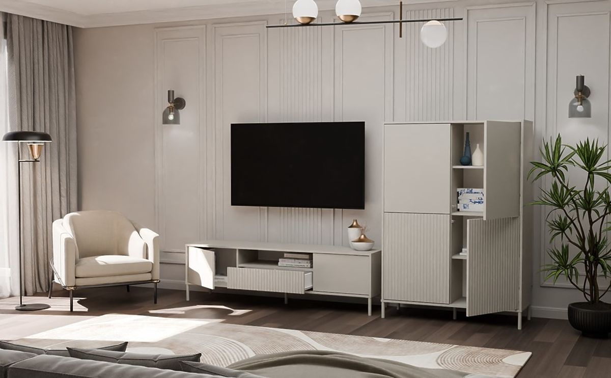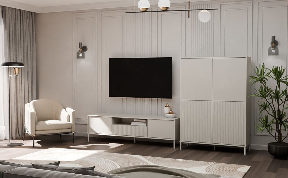Szafka RTV KAMARO z żłobionymi frontami i kaszmirowym wykończeniem. .. więcej