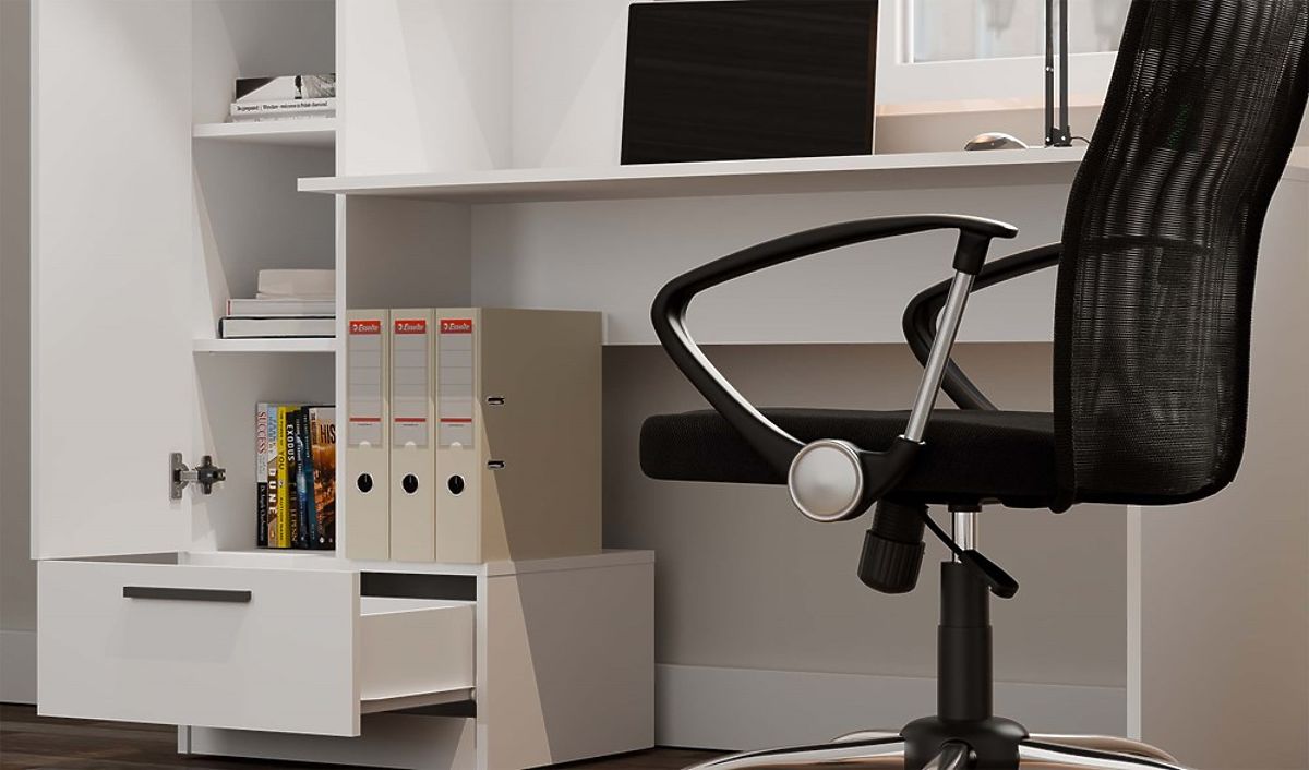 Przemyślane rozwiązanie 2w1 – biurko i regał z zamykanym miejscem do przechowywania