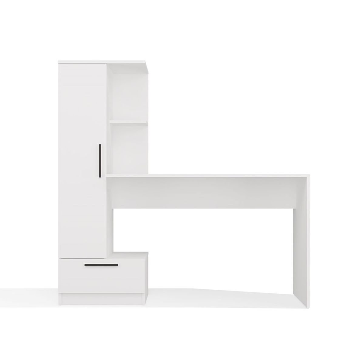 Zintegrowany regał wyposażony jest w część zamykaną drzwiami, za którymi znajdują się trzy przestronne półki, a także szufladę i otwarte półki, dzięki czemu łatwo posegregujesz wszystkie potrzebne rzeczy – od książek i dokumentów po drobiazgi.