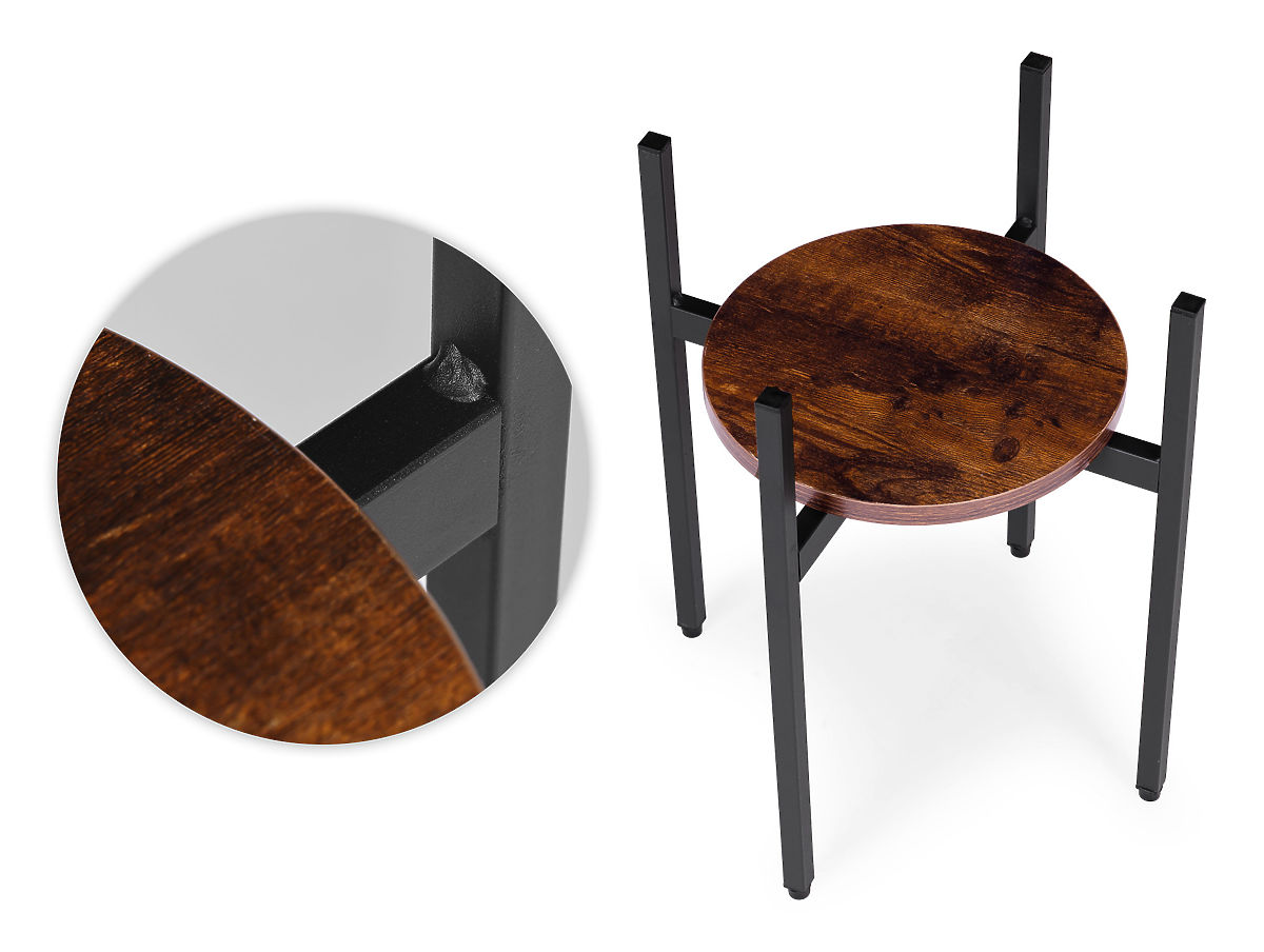 TRWAŁE MATERIAŁYStojak na kwiaty jest wykonany ze stali z powłoką proszkową, co zapewnia odporność na korozję i uszkodzenia mechaniczne. Półka z płyty wiórowej jest wykończona w kolorze imitującym naturalne drewno, co podkreśla dekoracyjny, loftowy charakter mebla.