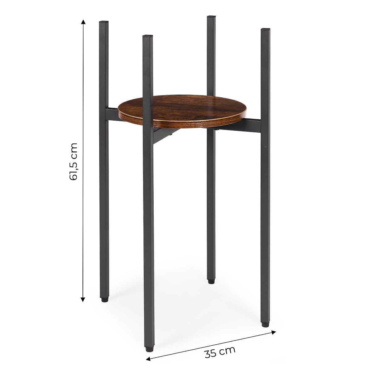 TRWAŁE MATERIAŁYStojak na kwiaty jest wykonany ze stali z powłoką proszkową, co zapewnia odporność na korozję i uszkodzenia mechaniczne. Półka z płyty wiórowej jest wykończona w kolorze imitującym naturalne drewno, co podkreśla dekoracyjny, loftowy charakter mebla.