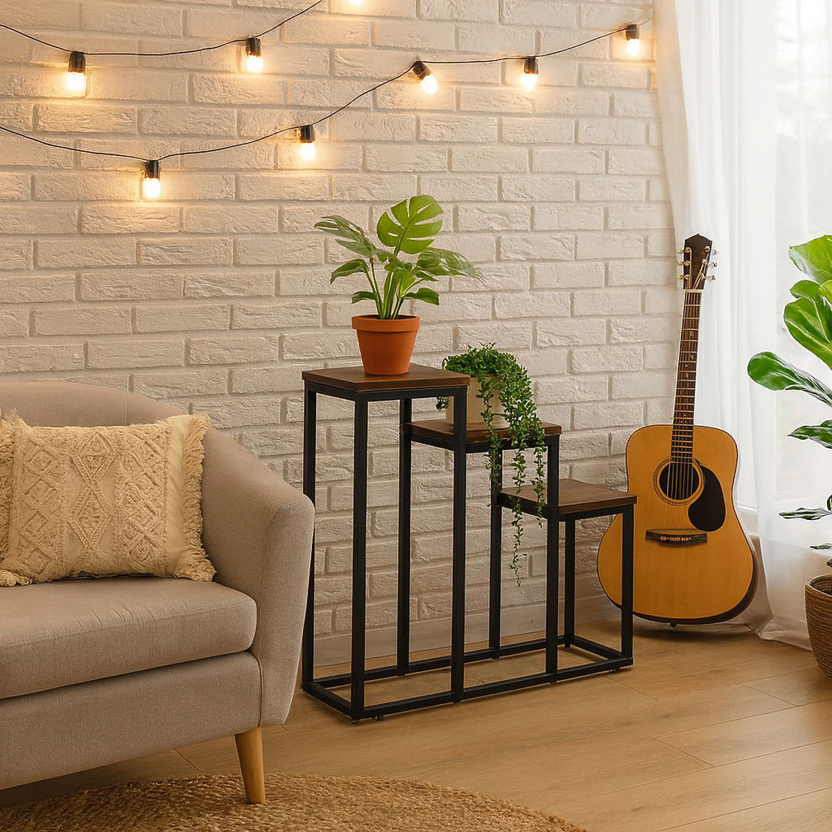 TRWAŁE MATERIAŁYStojak na kwiaty jest wykonany ze stali z powłoką proszkową, co zapewnia odporność na korozję i uszkodzenia mechaniczne. Półki z płyty wiórowej są wykończone w kolorze imitującym naturalne drewno, co podkreśla dekoracyjny, loftowy charakter mebla.
