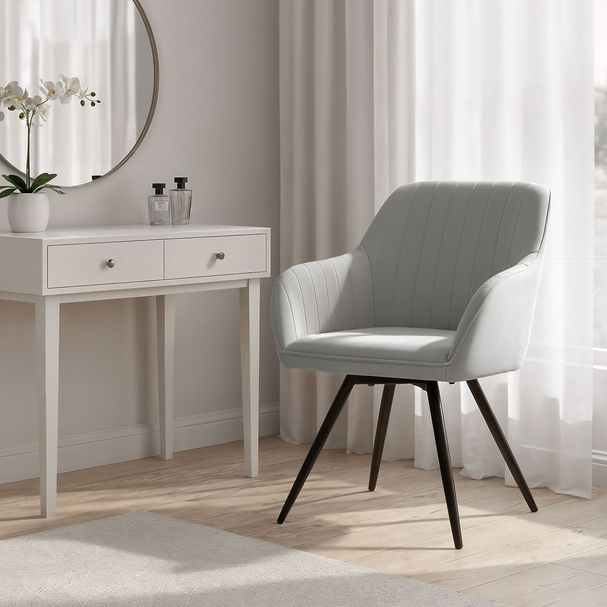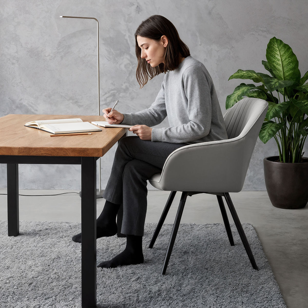 Obrotowe krzesło TURNO jest przeznaczone dla miłośników nowoczesnych, sprytnych i praktycznych rozwiązań. Krzesło obraca się w zakresie 360°, co zapewnia wyjątkowy komfort użytkowania. Doskonale sprawdza się zwłaszcza w małych przestrzeniach – nie trzeba go odsuwać, co oznacza, że zajmuje mniej miejsca niż zwykłe krzesło. O wygodę siedzenia dba eleganckie, aksamitne obicie z pionowym przeszyciem oraz wypełnienie z pianki o wysokiej gęstości. Obrotowe krzesło TURNO doskonale pasuje do wnętrz w stylu industrialnym, nowoczesnym lub mid-century modern.