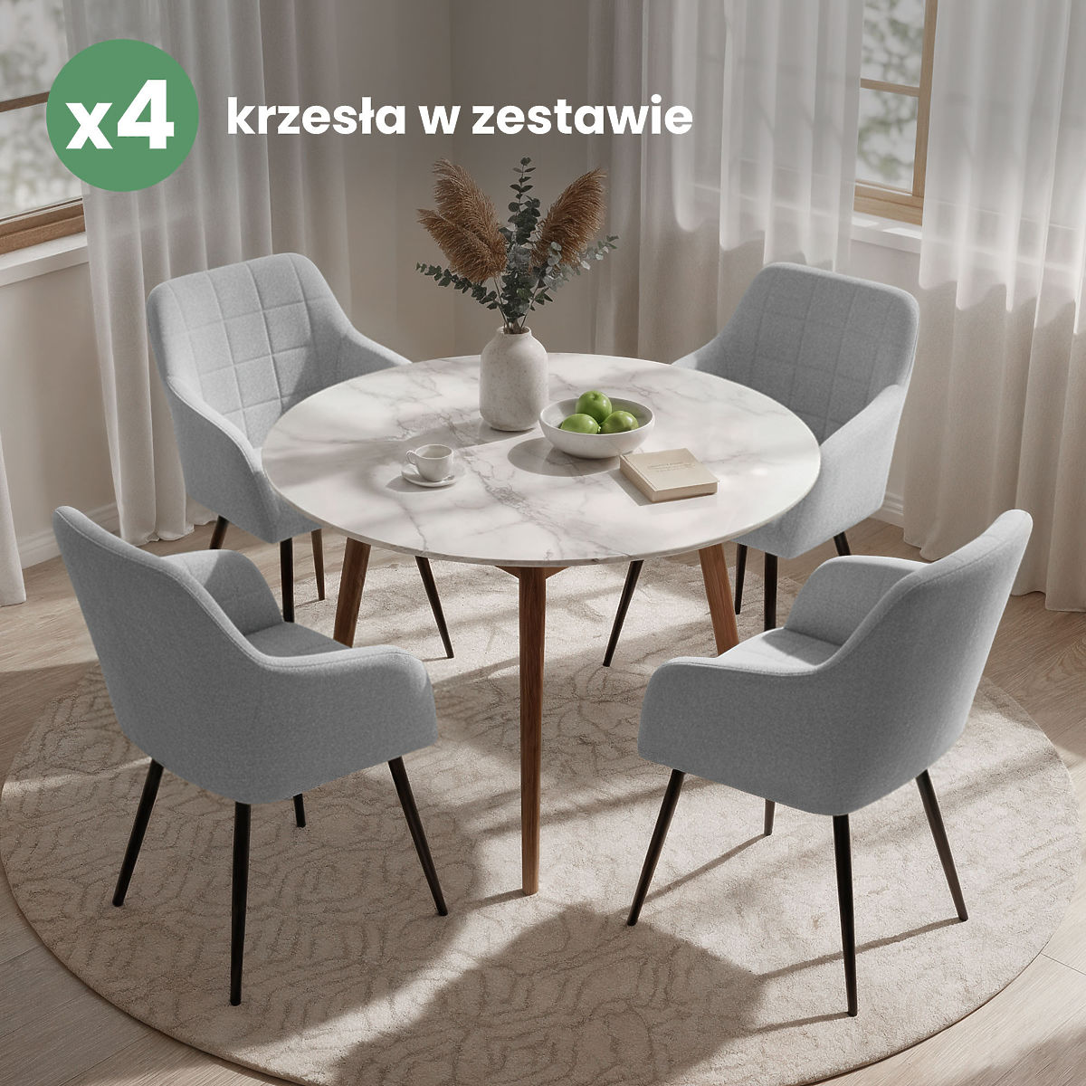 Tapicerowane krzesła łączą estetyczny wygląd z komfortem użytkowania i dobrze wpisują się w różne style wnętrz. Ich uniwersalna forma sprawia, że są odpowiednie do jadalni, salonu lub przestrzeni biurowej. Dostępne są w dwóch wariantach materiałowych – w tkaninie Lumos lub w welurze.