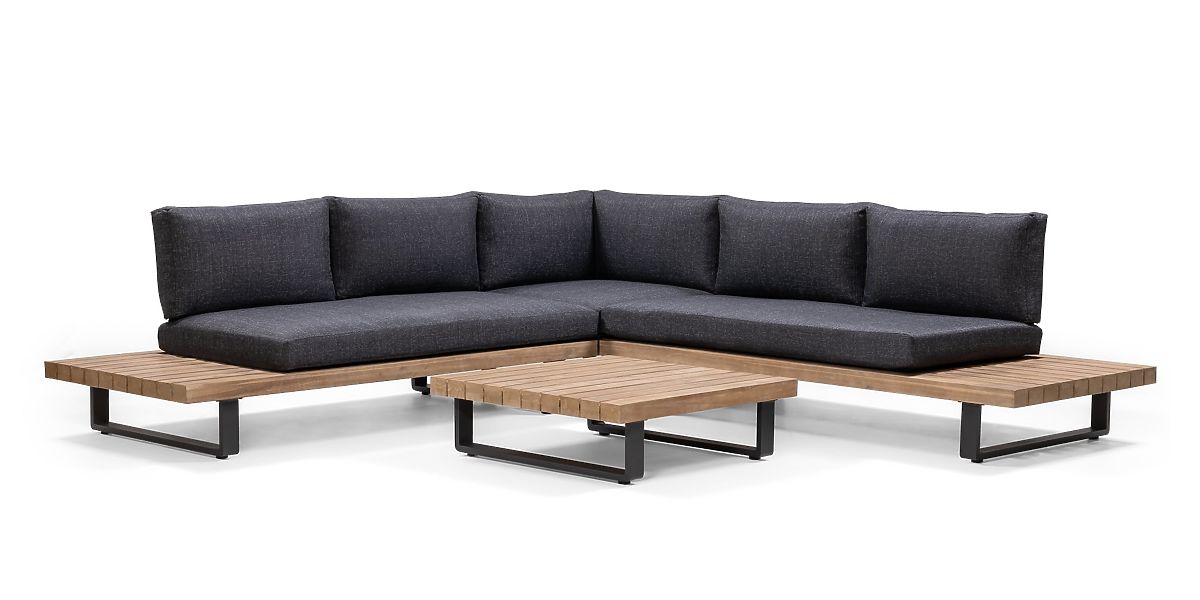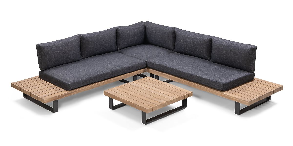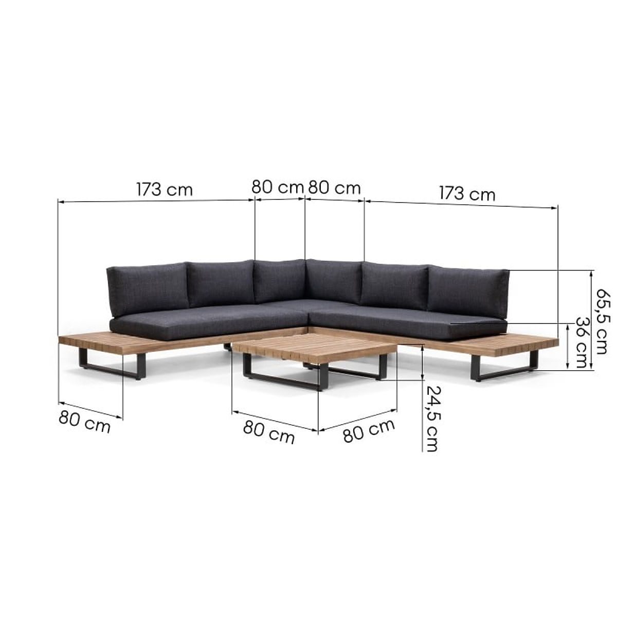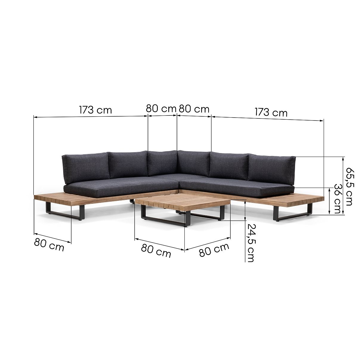 Ogrodowa sofa narożna ze stolikiem Borgo, drewno akacjowe FSC, wygląd teakowy, szara