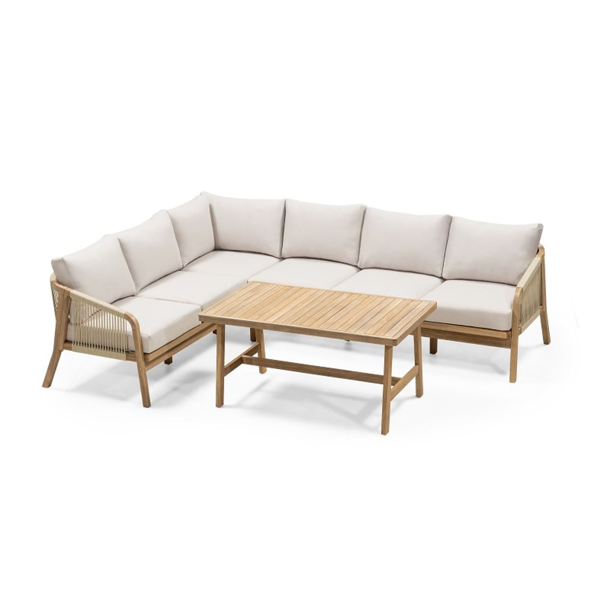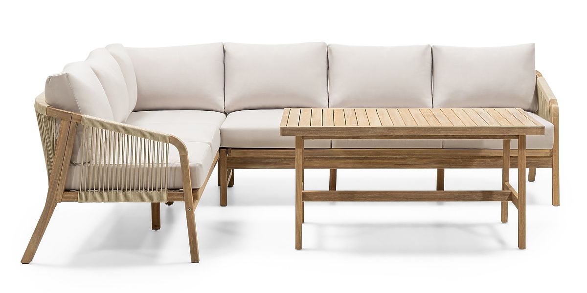 Lukahome.pl » Meble ogrodowe / Zestawy ogrodowe / Ogrodowy narożny zestaw z stołem Castello, plecionka, drewno akacjowe FSC, wygląd teakowy, beżowy