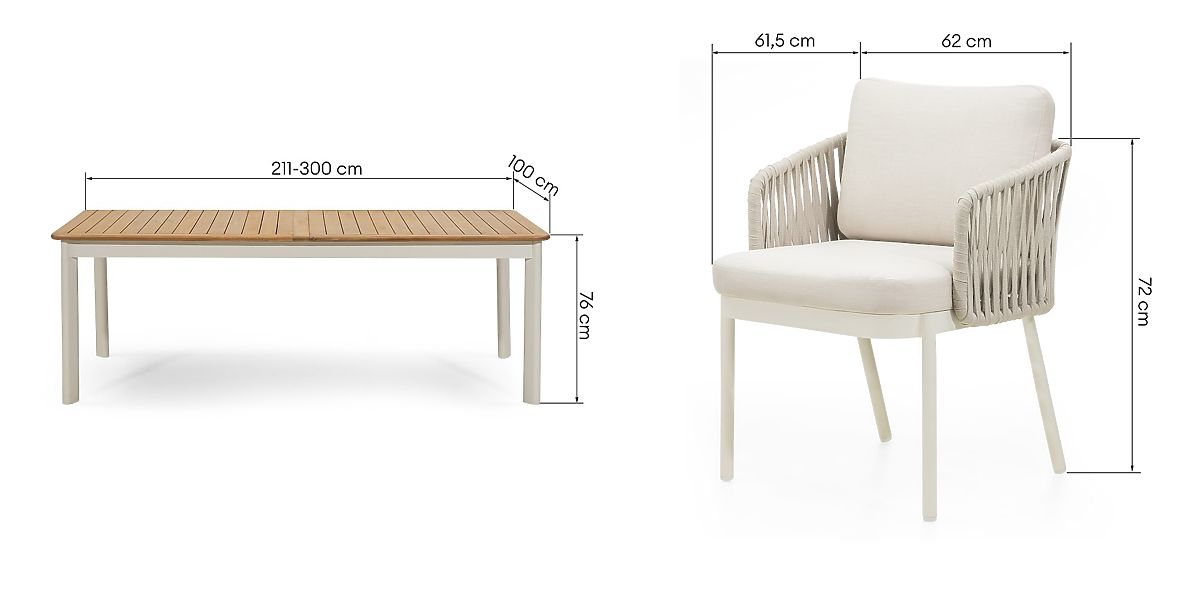 Zestaw ogrodowy Porticato to kwintesencja nowoczesnego designu i komfortu użytkowania. Składa się z rozkładanego stołu i czterech stylowych krzeseł, które razem tworzą funkcjonalną i estetyczną przestrzeń do odpoczynku na świeżym powietrzu. Jasnobeżowa kolorystyka, połączenie drewna i metalu oraz starannie dobrane detale zapewniają, że zestaw doskonale komponuje się zarówno z zielenią ogrodu, jak i nowoczesnym tarasem. Zarówno stół, jak i krzesła Porticato mają lekką, ale jednocześnie solidną konstrukcję z aluminium malowanego proszkowo na jasnobeżowy kolor. To rozwiązanie gwarantuje odporność na korozję i uszkodzenia mechaniczne. Rozkładany blat stołu, wykonany z trwałego drewna akacjowego z wykończeniem tekowym, umożliwia swobodne dostosowanie jego długości do liczby gości i okazji. Dodatkowym atutem jest certyfikat FSC®, który potwierdza pochodzenie drewna z odpowiedzialnie zarządzanych źródeł. Krzesła zachwycają wyjątkowym komfortem – dzięki plecionym oparciom z trwałego sznura i miękkim poduszkom z hydrofobowej tkaniny. To idealne miejsce do odpoczynku z filiżanką kawy, książką czy podczas długich rozmów z bliskimi. Meble wykonane z naturalnego drewna zachowują jego charakterystyczne właściwości, dlatego wszelkie nierówności, zadrapania, rysy, sęki, pęknięcia, szczeliny, dziurki, wgłębienia, nierówne krawędzie, różnorodne rysunki, różnice kolorystyczne i inne nieregularności w strukturze są celowo zachowane podczas procesu produkcji. Te cechy podkreślają autentyczność materiału, nadają każdemu naszemu produktowi unikalny charakter, co może prowadzić do różnic w wyglądzie w porównaniu z prezentowanymi zdjęciami. Aby zestaw utrzymał swój doskonały stan przez długi czas, zaleca się przechowywanie go w okresie zimowym w suchym i przewiewnym miejscu pod zadaszeniem, co zapewni mu ochronę przed warunkami atmosferycznymi.