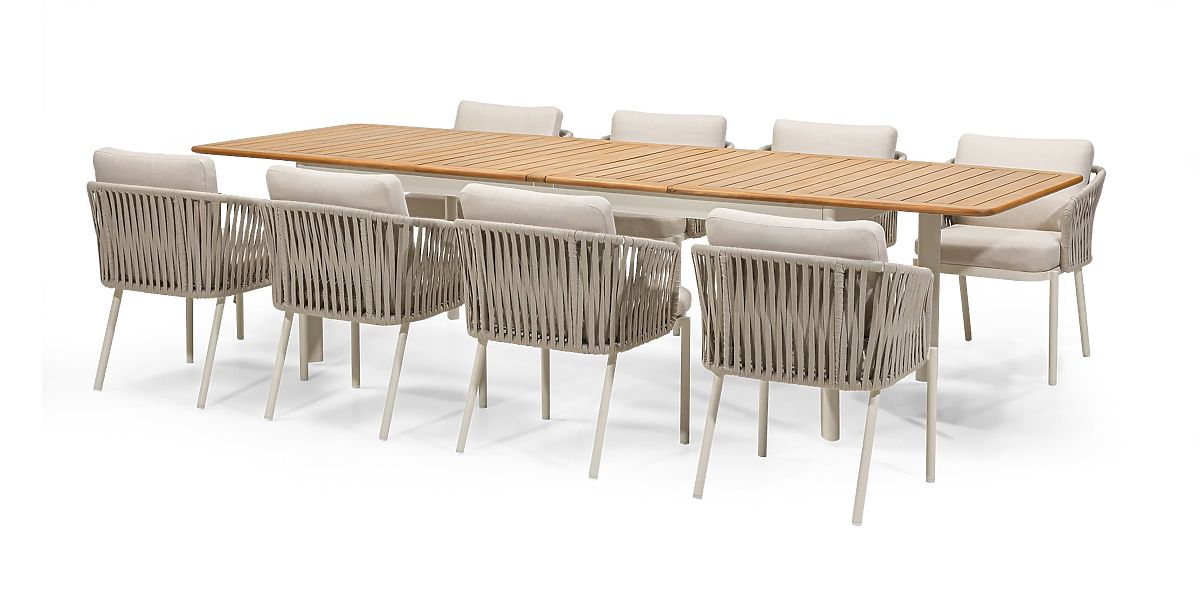 Zestaw ogrodowy Porticato to kwintesencja nowoczesnego designu i komfortu użytkowania. Składa się z rozkładanego stołu i ośmiu stylowych krzeseł, które razem tworzą funkcjonalną i estetyczną przestrzeń do odpoczynku na świeżym powietrzu. Jasnobeżowa kolorystyka, połączenie drewna i metalu oraz starannie dobrane detale zapewniają, że zestaw idealnie komponuje się zarówno z zielenią ogrodu, jak i nowoczesnym tarasem. Zarówno stół, jak i krzesła Porticato mają lekką, a jednocześnie solidną konstrukcję z aluminium z powłoką proszkową w jasnobeżowym kolorze. To rozwiązanie gwarantuje odporność na korozję i uszkodzenia mechaniczne. Rozkładany blat stołu, wykonany z trwałego drewna akacjowego z wykończeniem teakowym, pozwala łatwo dostosować jego długość do liczby gości i okazji. Dodatkowym atutem jest certyfikat FSC®, który potwierdza pochodzenie drewna z odpowiedzialnie zarządzanych źródeł. Krzesła zachwycają wyjątkowym komfortem – dzięki plecionym oparciom z trwałego sznura i miękkim poduszkom z hydrofobowej tkaniny. To idealne miejsce na odpoczynek z filiżanką kawy, książką lub podczas długich rozmów z bliskimi. Meble wykonane z naturalnego drewna zachowują jego charakterystyczne cechy, dlatego wszelkie nierówności, zadrapania, rysy, sęki, pęknięcia, szczeliny, dziurki, wgłębienia, nierówne krawędzie, różne rysunki drewna, różnice kolorystyczne i inne nieregularności w strukturze są celowo zachowane podczas procesu produkcji. Te cechy podkreślają autentyczność materiału, nadają każdemu naszemu produktowi unikalny charakter, co może prowadzić do różnic w wyglądzie w porównaniu do prezentowanych zdjęć. Aby zestaw zachował swój doskonały stan przez długi czas, zaleca się jego przechowywanie w suchym i wentylowanym miejscu pod zadaszeniem podczas zimowego okresu, aby chronić go przed warunkami atmosferycznymi.