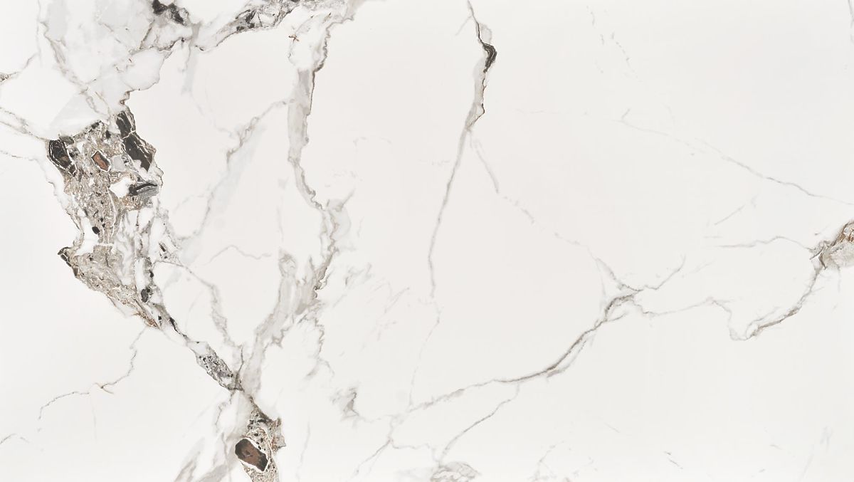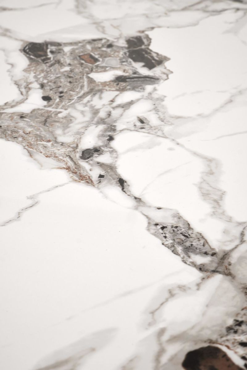 Stół z blatem z białego marmuru i czarnymi nogami. .. więcej