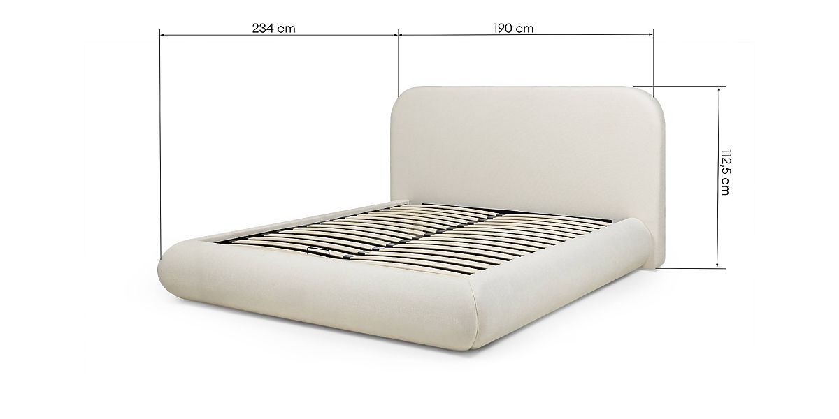 Tapicerowane łóżko Lumi z zaokrąglonym wezgłowiem i schowkiem. .. więcej