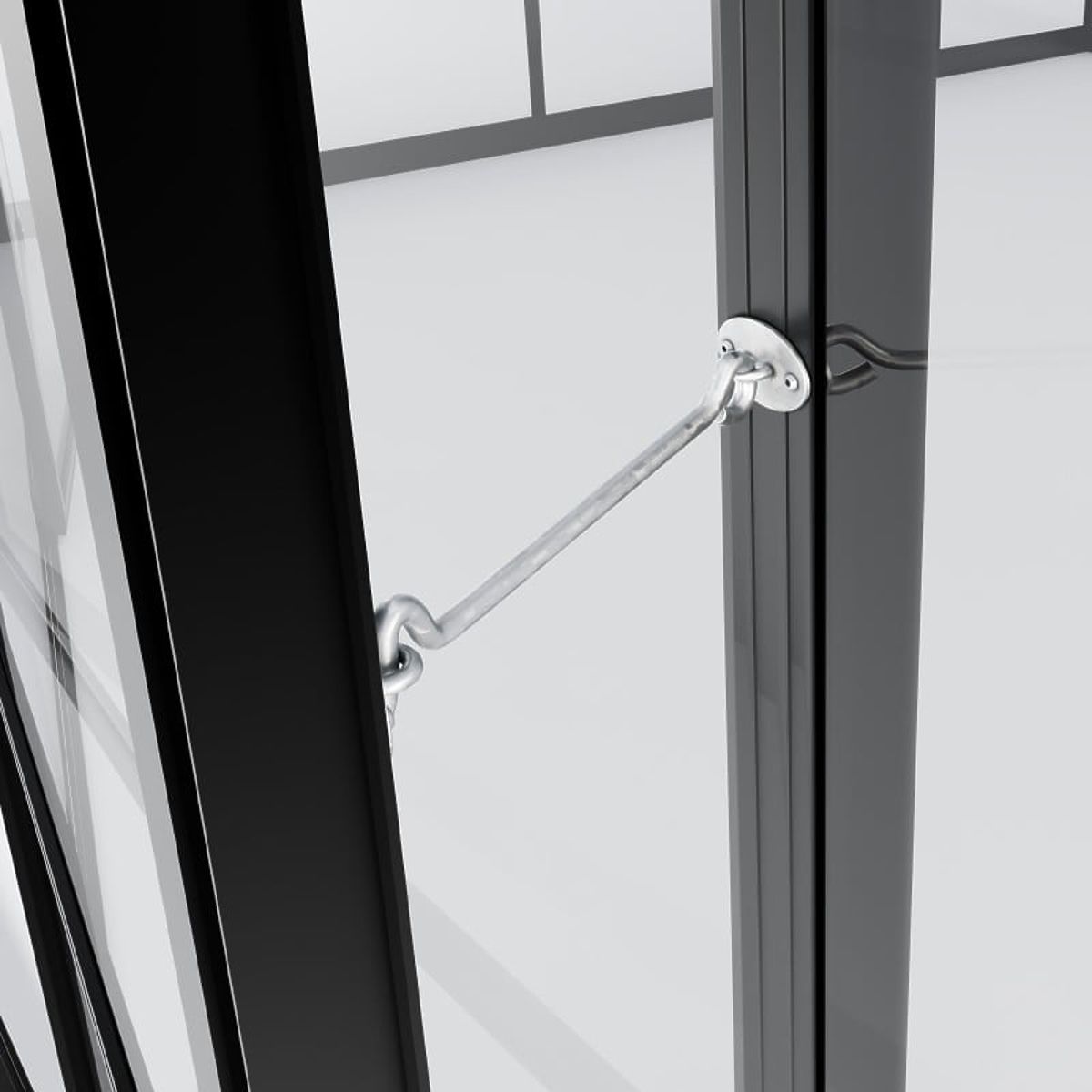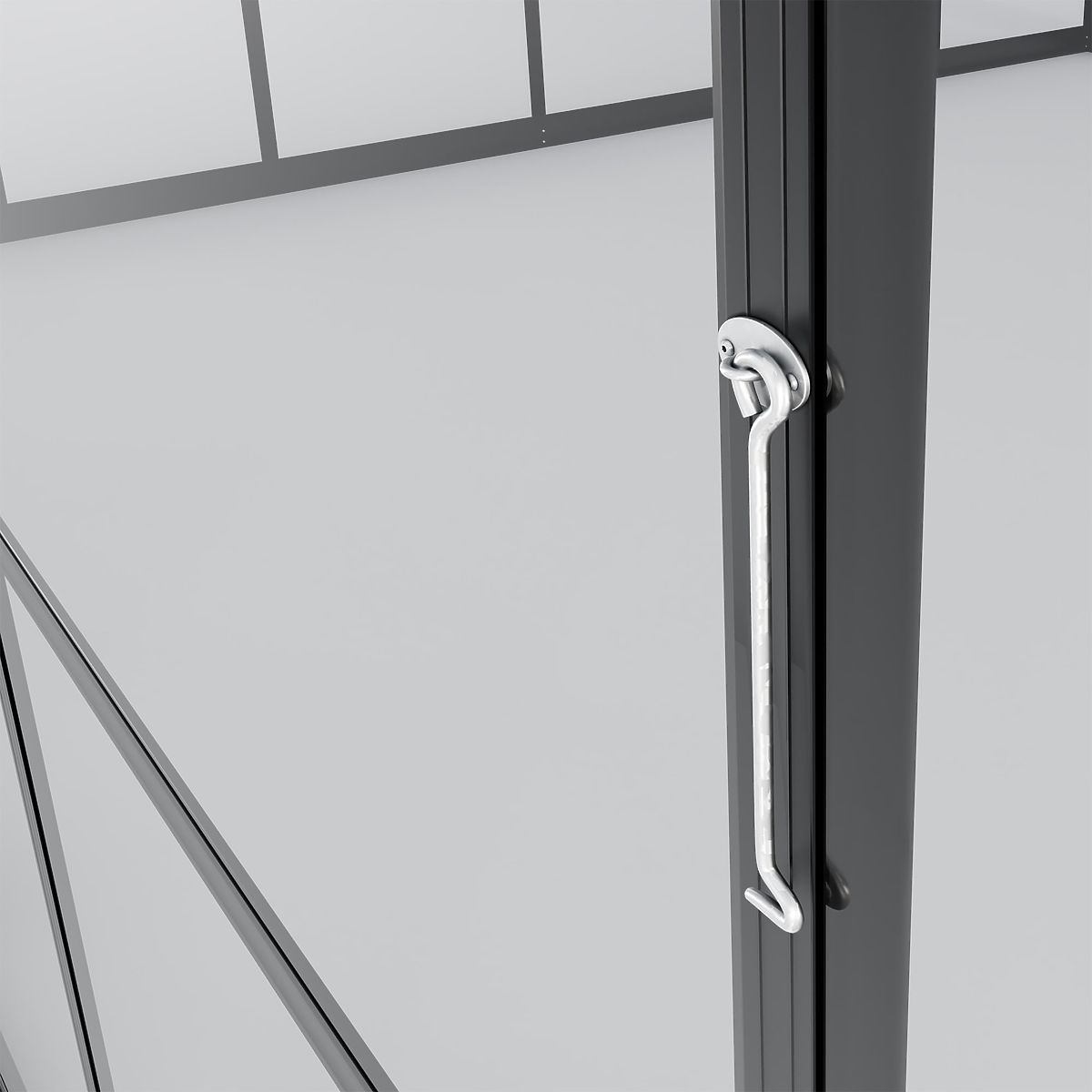 Szklarnia posiada solidną aluminiową konstrukcję o grubości 1-1,8 mm, wzmocnioną nierdzewnymi śrubami. Dodatkową stabilność zapewnia metalowa podstawa o wysokości 12 cm. Dwa uchylne okna i dwuskrzydłowe drzwi z zamkiem zapewniają odpowiednią wentylację, co jest kluczowe dla zdrowego wzrostu roślin i komfortowego pobytu w szklarni. Niski próg przy wejściu ułatwia wnoszenie sprzętu, takiego jak kosiarka czy taczka.