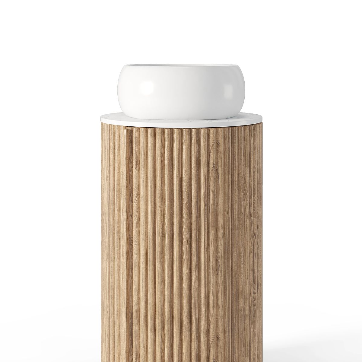 Zestaw La promessa łączy dębową szafkę z białą ceramiczną umywalką. .. więcej