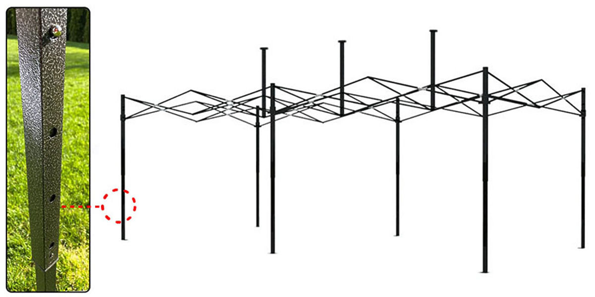 Wysokość pawilonu można dostosować do Twoich potrzeb dzięki 4 stopniom regulacji (280, 290, 300 i 310 cm). Oznacza to, że łatwo dostosujesz go do preferowanej wysokości. Montaż, demontaż i regulacja składanego pawilonu jest bardzo prosta dzięki systemowi zatrzaskowemu. Wystarczy nacisnąć przycisk, aby obniżyć konstrukcję. Jeśli chcesz podnieść pawilon, wykonaj tę samą czynność i jednocześnie podnieś ruchomy element do góry. Dzięki temu innowacyjnemu rozwiązaniu dostosowanie pawilonu do Twoich potrzeb jest szybkie i wygodne. Niezależnie od sytuacji możesz łatwo zmieniać wysokość pawilonu, aby zapewnić sobie optymalne warunki i komfort użytkowania.