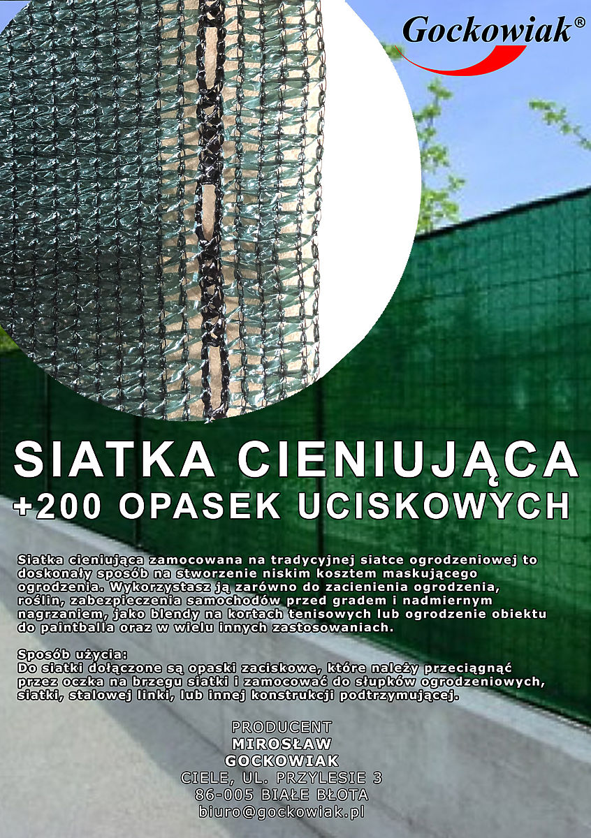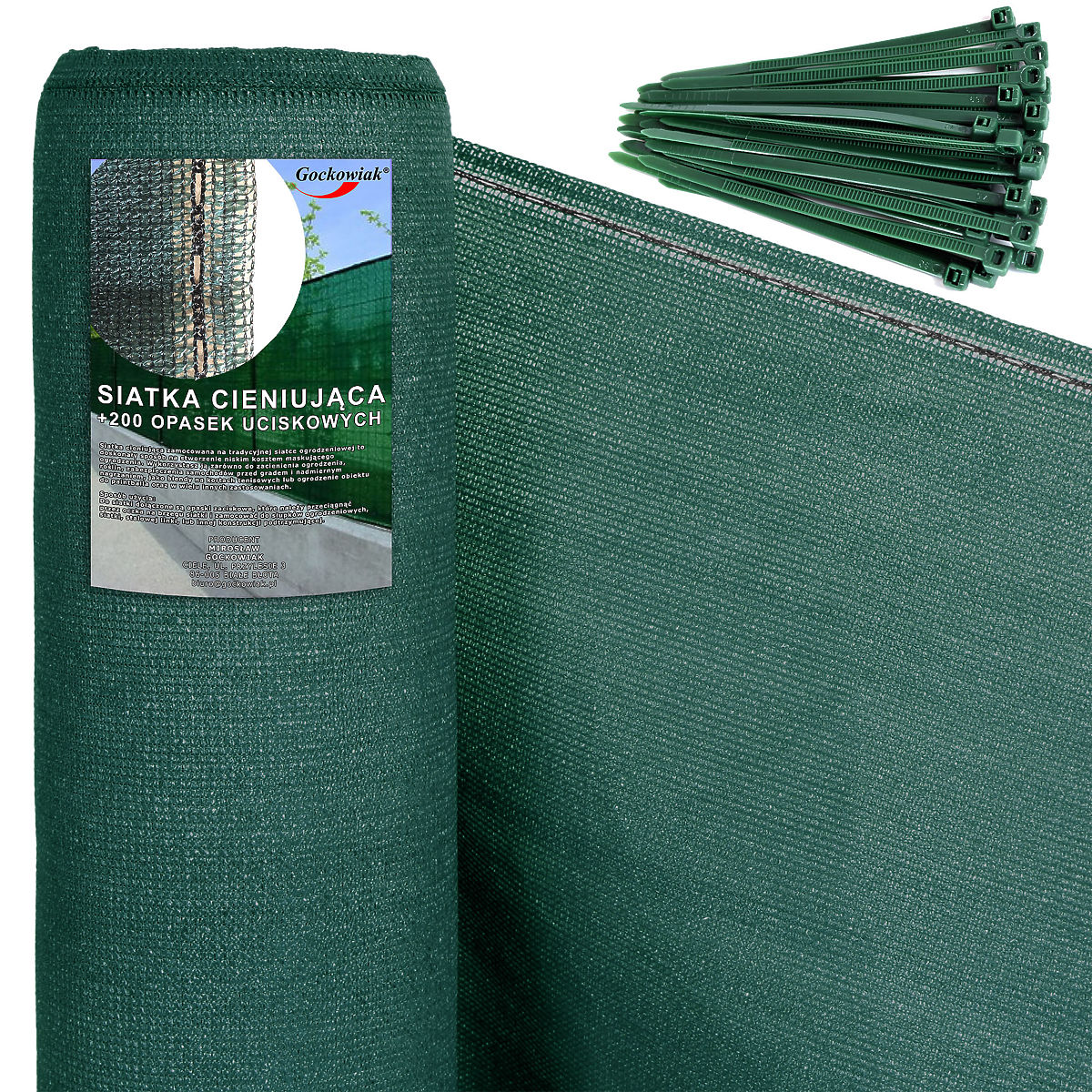 Siatka cieniująca to doskonały sposób na stworzenie maskującego ogrodzenia przy niskich kosztach. Jej głównym zadaniem jest ograniczenie widoczności i dostępu światła przy jednoczesnym zachowaniu odpowiedniej wentylacji. Siatka jest gęsto pleciona, wykonana z najwyższej jakości materiałów HDPE i PP. Zawiera filtr UV, który wzmacnia i wydłuża jej żywotność. Redukuje do 90% światła słonecznego. Wersja z wzmocnieniem w postaci szwów polipropylenowych blisko oczek montażowych. W opakowaniu znajduje się 200 sztuk opasek zaciskowych. Siatka jest złożona do kompaktowych rozmiarów do transportu.
