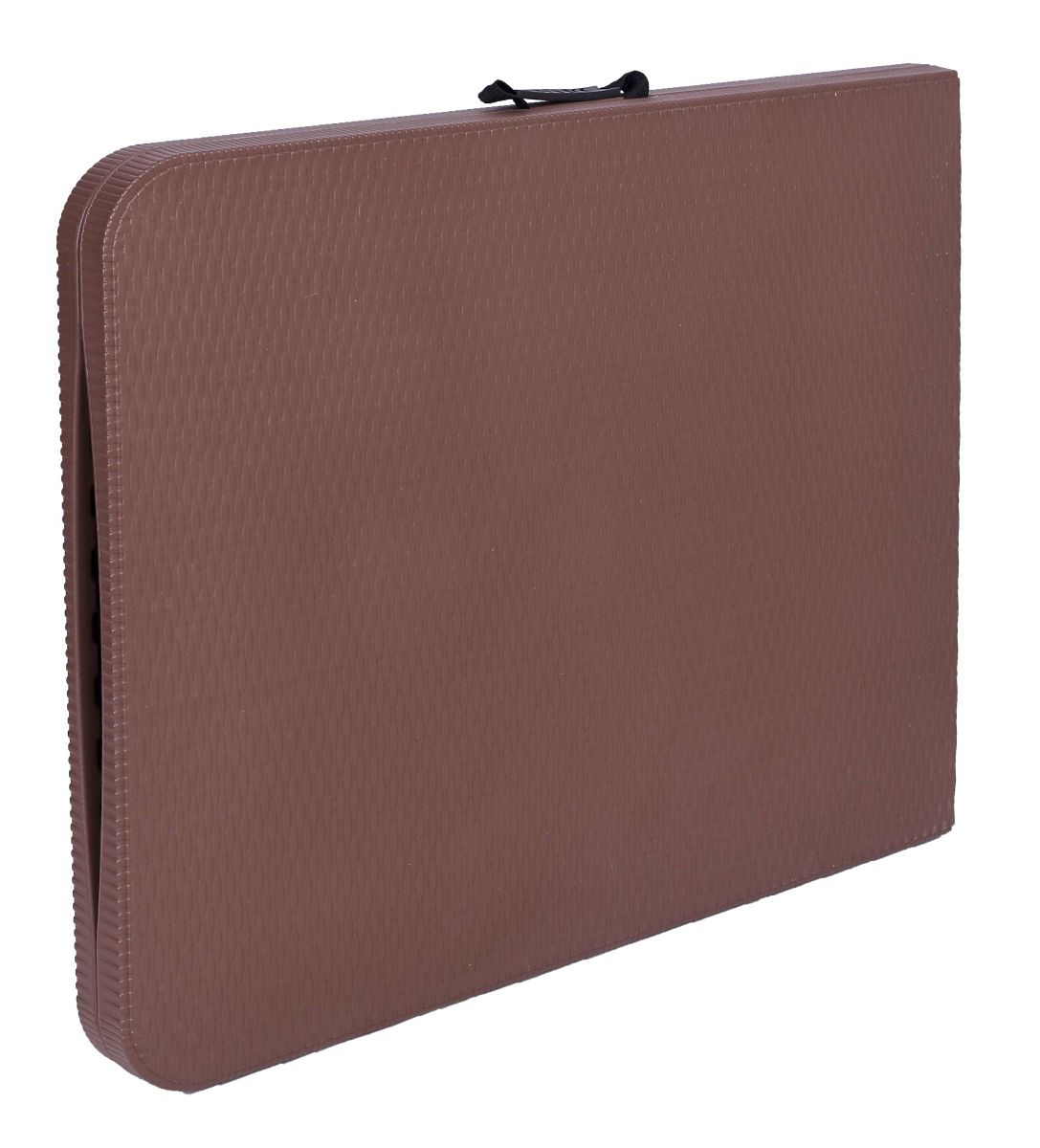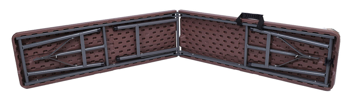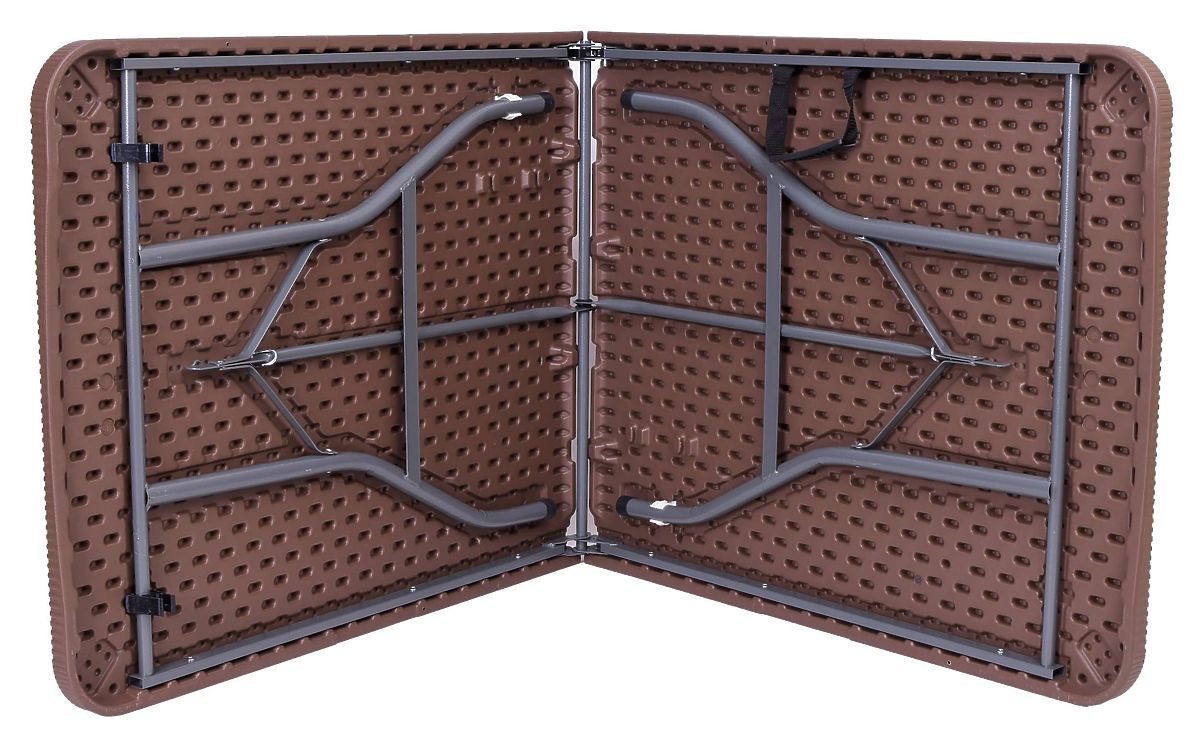 Składany stół cateringowy. Bardzo praktyczny i lekki. Konstrukcja z malowanej proszkowo stali. Blat z polietylenu HDPE. Wzór jak rattan. Odporny na promieniowanie słoneczne. Dzięki unikalnemu designowi cała konstrukcja chowa się w blacie stołu, zajmuje mało miejsca i tworzy ergonomiczną walizkę, łatwą do przenoszenia.