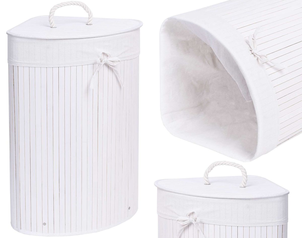 Bambusowy narożny kosz na pranie z białą pokrywą