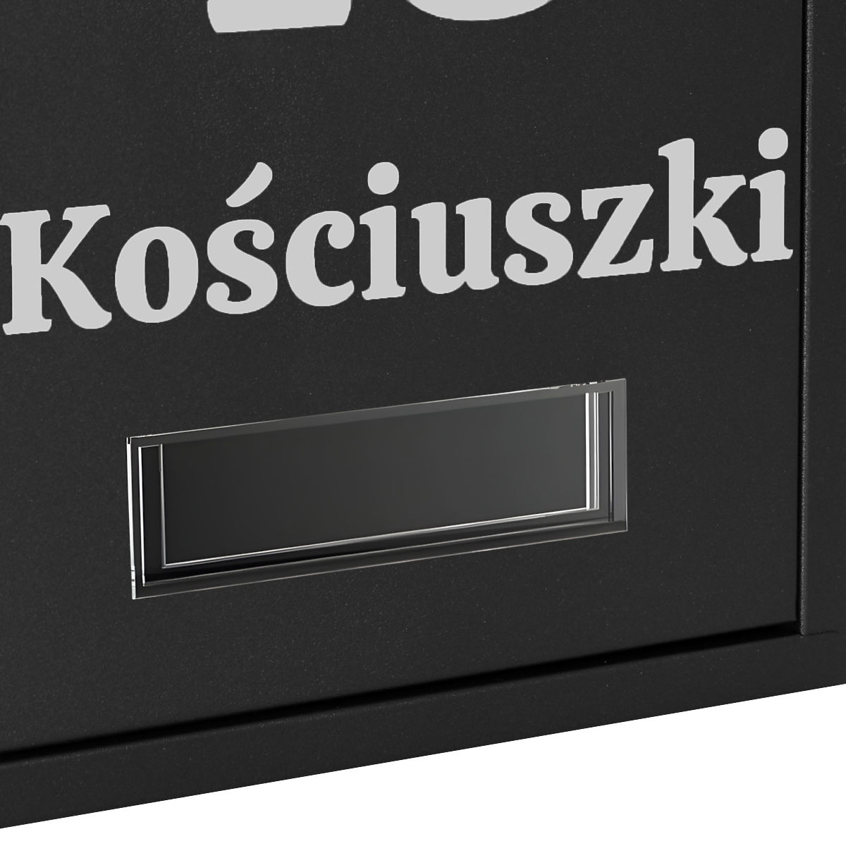 Możliwość wykonania dowolnego napisu: numer domu, nazwa firmy, nazwisko, ulica itp. Napis wykonany metodą ploteru folią Oracal, odporną na warunki atmosferyczne. Folia jest w kolorze srebrnym