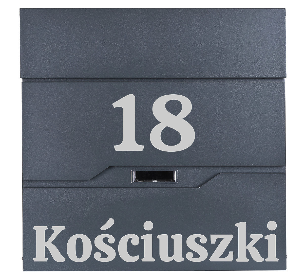 Możliwość wykonania dowolnego napisu: numer domu, nazwa firmy, nazwisko, ulica itp. Napis wykonany metodą ploterowania folią Oracal, odporną na warunki atmosferyczne. Folia jest w kolorze srebrnym.