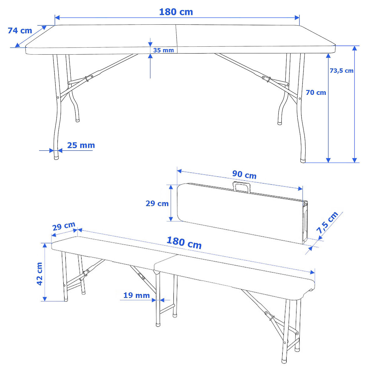 Składany zestaw cateringowy. Bardzo praktyczny i lekki. Konstrukcja z malowanej proszkowo stali. Blat i siedziska z wytrzymałego plastiku HDPE. Zarówno stół, jak i ławki mają specjalne zamki składania, dzięki którym po rozłożeniu są stabilne. Zestaw jest odporny na warunki atmosferyczne i promieniowanie UV. Stół i ławki po złożeniu tworzą praktyczne walizki, dzięki czemu zajmują mało miejsca i są łatwe do przenoszenia. Wbudowane uchwyty ułatwiają przenoszenie. Nogi stołu i ławek mają antypoślizgowe końcówki, które zapewniają stabilność.