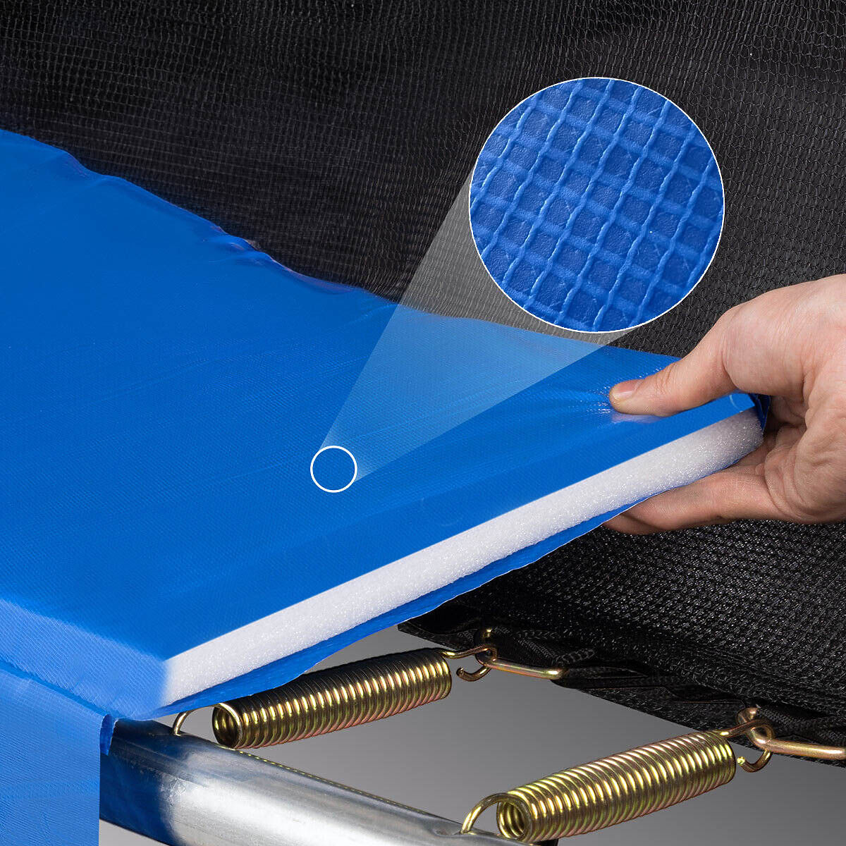 Materiał maty skaczącej: PP (polipropylen) o gramaturze 275g/m2 - dla wygody i bezpieczeństwa podczas skakania.