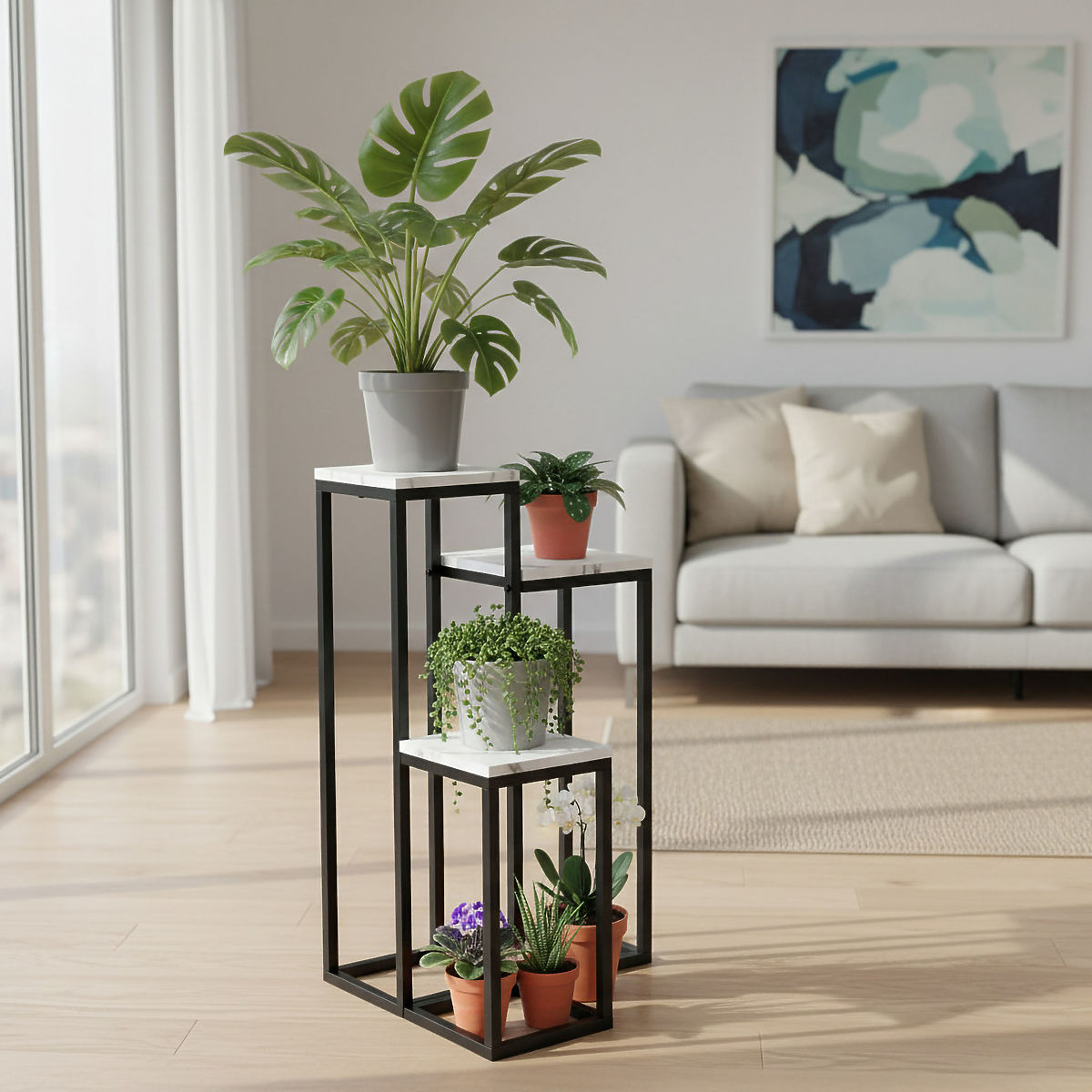 Stojak na kwiaty Munir Biały Marmur to elegancki i funkcjonalny dodatek, który odmieni Twoje wnętrze. Dzięki trzem poziomom zyskasz więcej miejsca na rośliny, dekoracje i dodatki, a jednocześnie porządek i estetykę w domu. Minimalistyczny design z efektem białego marmuru i stabilną, metalową podstawą w czarnym kolorze sprawia, że stojak jest idealny do nowoczesnych, loftowych i klasycznych aranżacji.