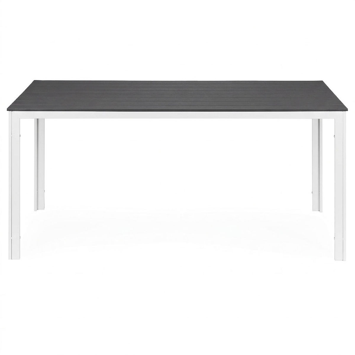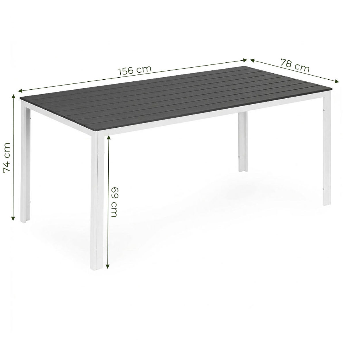 ESTETYCZNY I TRWAŁY BLATBlat wykonany jest ze specjalnego materiału polywood, który charakteryzuje się odpornością na warunki atmosferyczne. Jego forma i tekstura imitują naturalne drewno, nadając całości elegancki, ponadczasowy charakter. Małe szczeliny między deskami umożliwiają swobodny odpływ wody podczas deszczu, co zwiększa funkcjonalność stołu i ułatwia jego codzienne użytkowanie na zewnątrz.