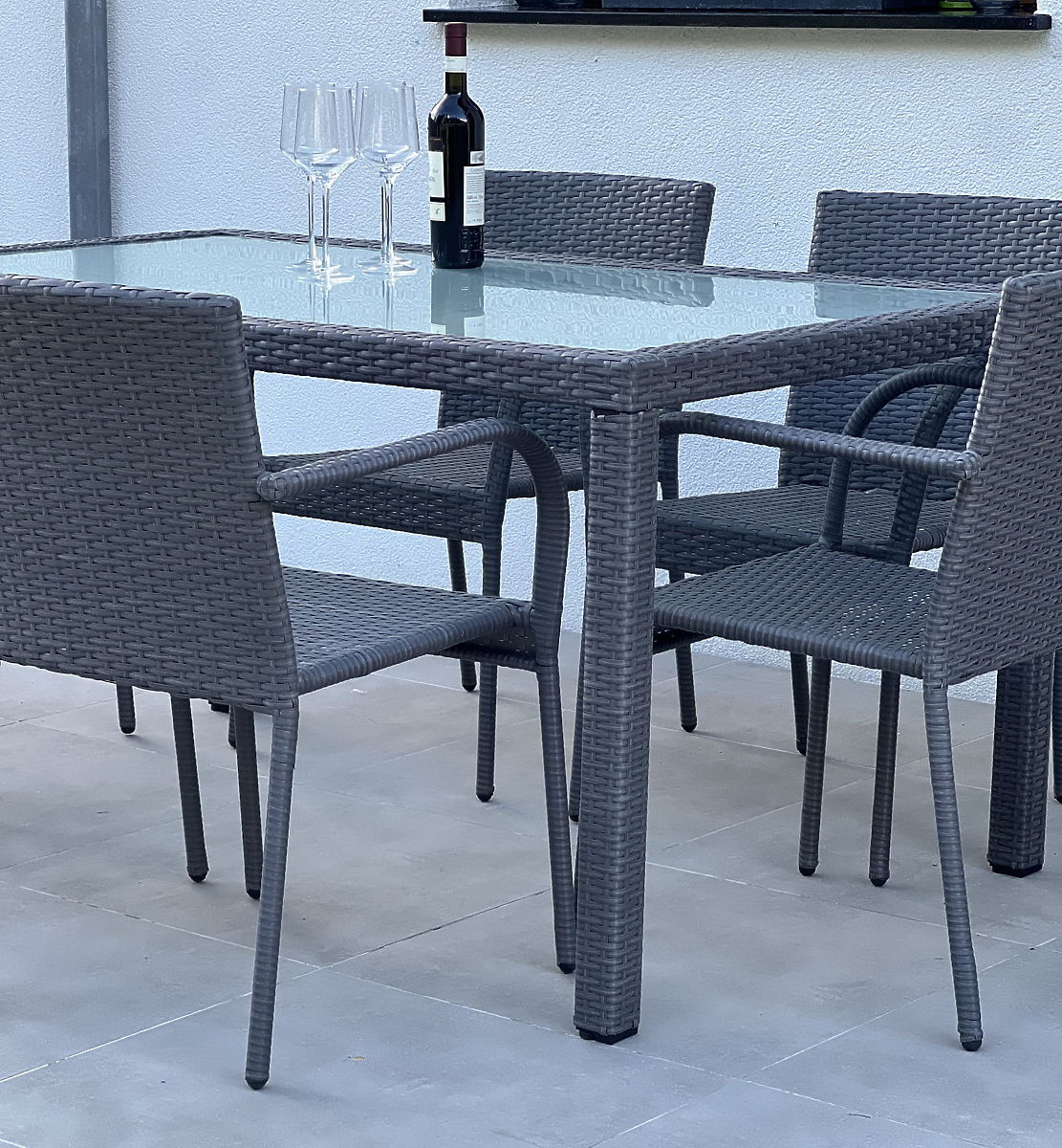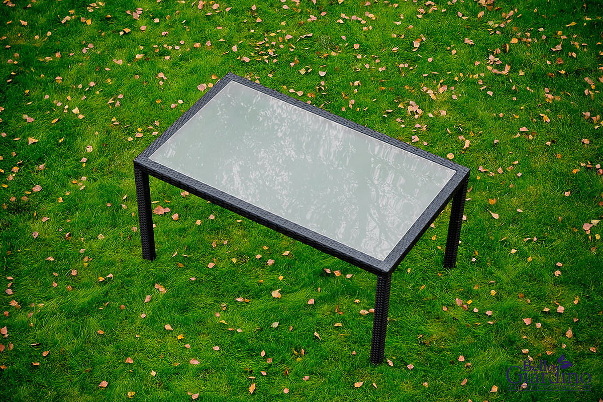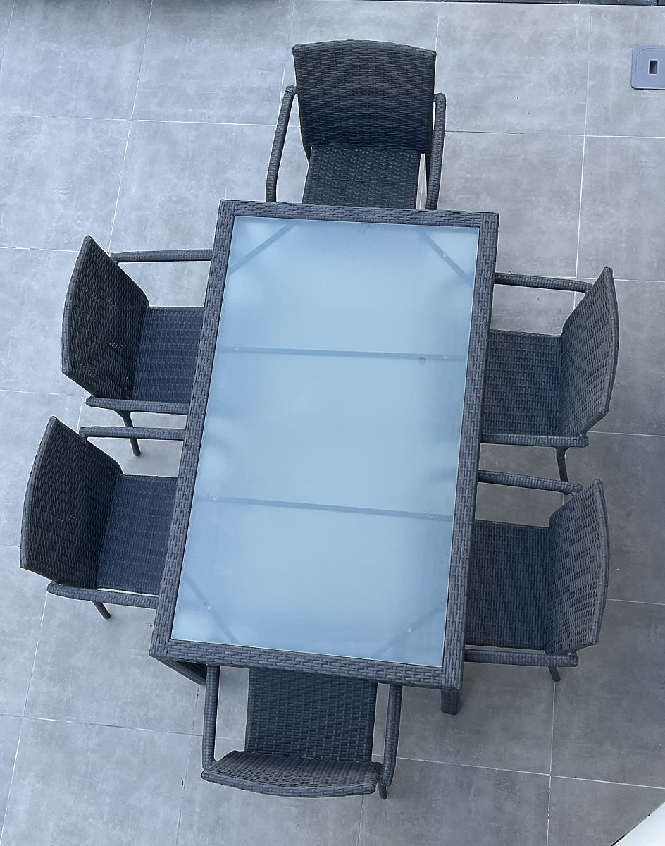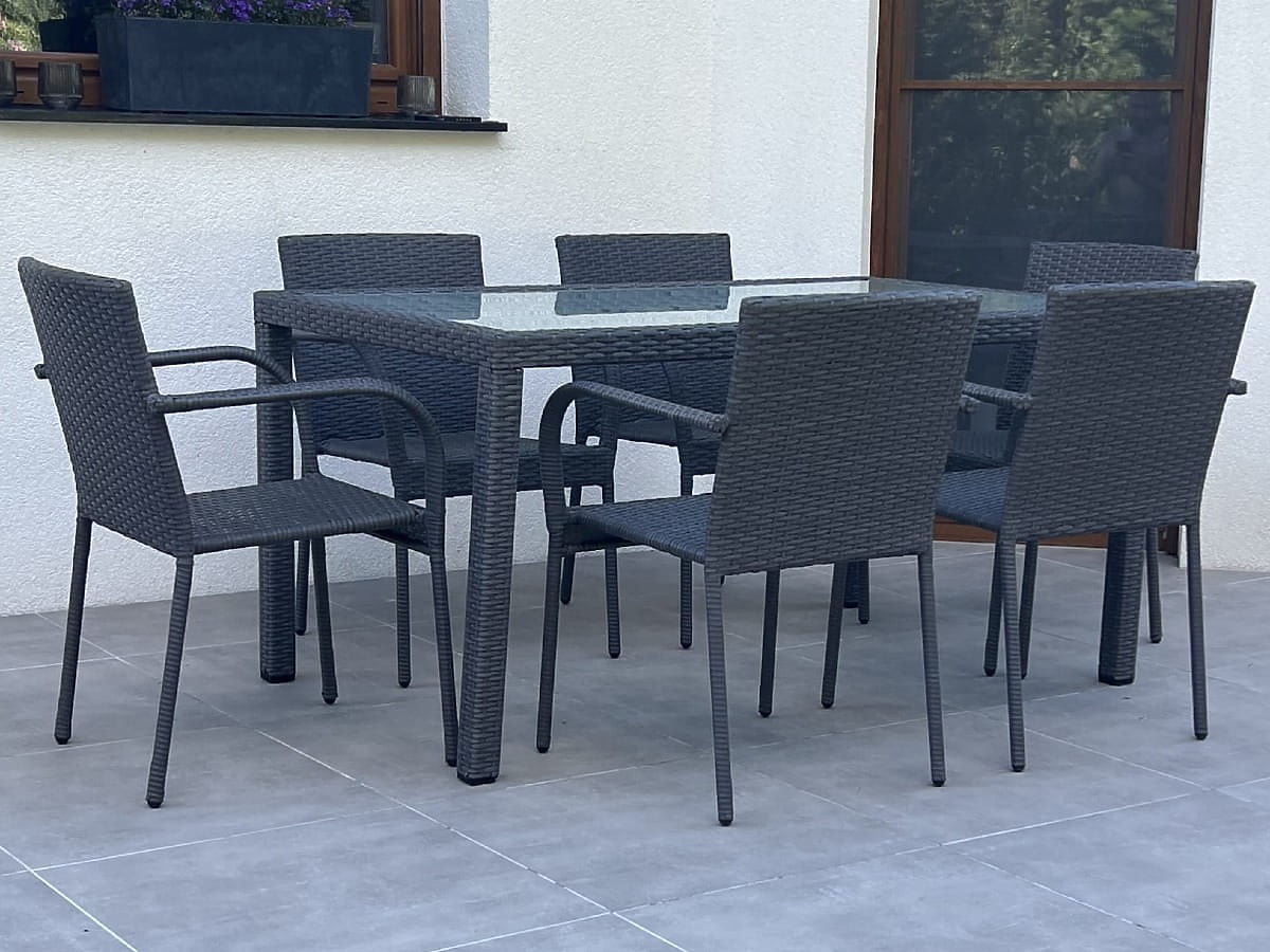 Konstrukcja mebli: stół – aluminium, krzesła – stal Zestaw zawiera 7 elementów: 1 × stół (z matowym blatem szklanym z 5 mm szkła bezpiecznego): długość 150 cm, szerokość 90 cm, wysokość 74 cm 6 × krzesła: szerokość 56 cm, głębokość 50 cm, wysokość 84 cm, wysokość siedziska od ziemi 44 cm, wysokość oparcia od siedziska 43 cm, szerokość siedziska 40 cm, głębokość siedziska 43 cm Zestaw dostarczany na 1 palecie o wymiarach 120 × 80 × 170 cm, waga 60 kg. Możliwość zakupu poduszek na krzesła tutaj. Krzesła można używać od razu po rozpakowaniu. Krzesła są sztaplowane (można je wkładać jedno w drugie), co znacznie ułatwia przechowywanie i oszczędza miejsce. Stół przeznaczony jest do prostego samodzielnego montażu według załączonej instrukcji. Matowy stół szklany jest osadzony w ramie z technoratanu. Technorattan jest odporny na szkodliwe warunki atmosferyczne, jednak dla dłuższego zachowania wyglądu zalecamy zakup pokrowca ochronnego. Pokrowiec w ciemnoszarym kolorze jest jednoczęściowy i posiada dolny sznurek do zaciągania. Wszystkie pokrowce są szyte na zamówienie, czas realizacji to około 14 dni roboczych.