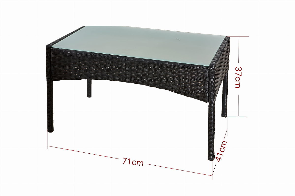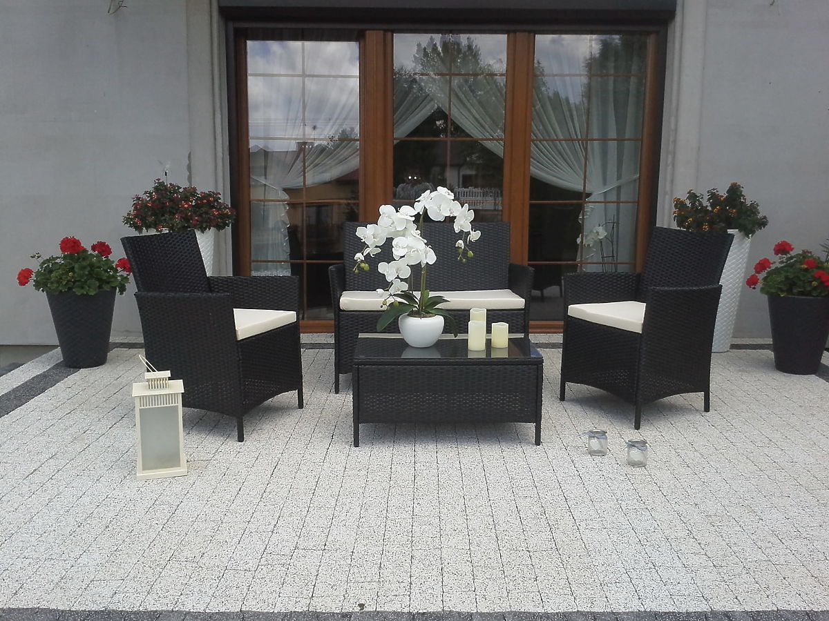 Zestaw mebli rattanowych COMODO to kwintesencja prostoty i elegancji, która zamienia każde miejsce do odpoczynku na świeżym powietrzu w wyjątkową przestrzeń. Ich luksusowy design wprowadza niepowtarzalną atmosferę, idealną do relaksu i spędzania wolnego czasu. Wykonane z syntetycznego rattanu, te meble są niezwykle odporne na wszelkie warunki atmosferyczne, w tym deszcz i promieniowanie UV, co gwarantuje ich trwałość i piękny wygląd przez wiele lat. Ponadczasowa elegancja mebli COMODO sprawia, że doskonale pasują do każdego otoczenia, stając się jego wyjątkową ozdobą. Dodatkowo, COMODO to meble, które zachwycają swoją lekkością i łatwością w utrzymaniu. Miękkie poduszki i ergonomiczne kształty zapewniają niezrównany komfort użytkowania, podczas gdy staranne wykonanie i dbałość o detale podkreślają ich wysoką jakość. Wybierając meble COMODO, inwestujesz w styl, wygodę i trwałość, które będą cieszyć przez wiele sezonów. Kolor zestawu COMODO: czarny – jednolity Plecionka: technorattan 7-8mm x 1,2mm, delikatnie prążkowana struktura Konstrukcja mebli: stalowa (wymaga prostego montażu) Zestaw składa się z 4 elementów (po złożeniu): 2 x fotel: szerokość: 58 cm głębokość: 57,5 cm wysokość: 80 cm 1 x sofa: szerokość: 104 cm głębokość: 57,5 cm wysokość: 80 cm 1 x stolik (z matowym blatem szklanym z 5mm szkła bezpiecznego): długość: 71 cm szerokość: 41 cm wysokość: 37 cm Poduszki są wliczone w cenę zestawu (3 sztuki na siedziska). Wszystkie mają zdejmowane pokrowce na zamek błyskawiczny, wykonane z wodoodpornego materiału (100% poliester), które można prać w niskich temperaturach. Grubość poduszek na siedziska: 5 cm. Technorattan jest odporny na szkodliwe wpływy warunków atmosferycznych, jednak dla jeszcze dłuższego zachowania niezmienionego wyglądu mebli zalecamy używanie i przechowywanie produktu pod dachem lub zakup pokrowca ochronnego. Pokrowiec w ciemnoszarym kolorze jest jednoczęściowy i posiada ściągacz na dole. Wszystkie pokrowce są szyte na zamówienie, a czas realizacji wynosi około 14 dni roboczych. Zdjęcia od naszych klientów:
