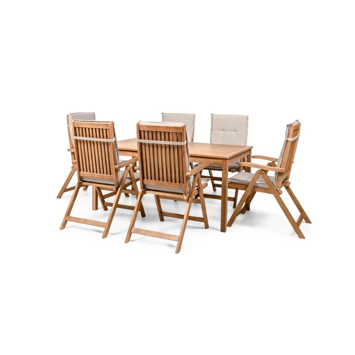Lukahome.pl » Meble ogrodowe / Zestawy ogrodowe / Zestaw ogrodowy Familis stół 160 cm + 6 krzeseł z regulowanymi oparciami i jasnoszarymi poduszkami